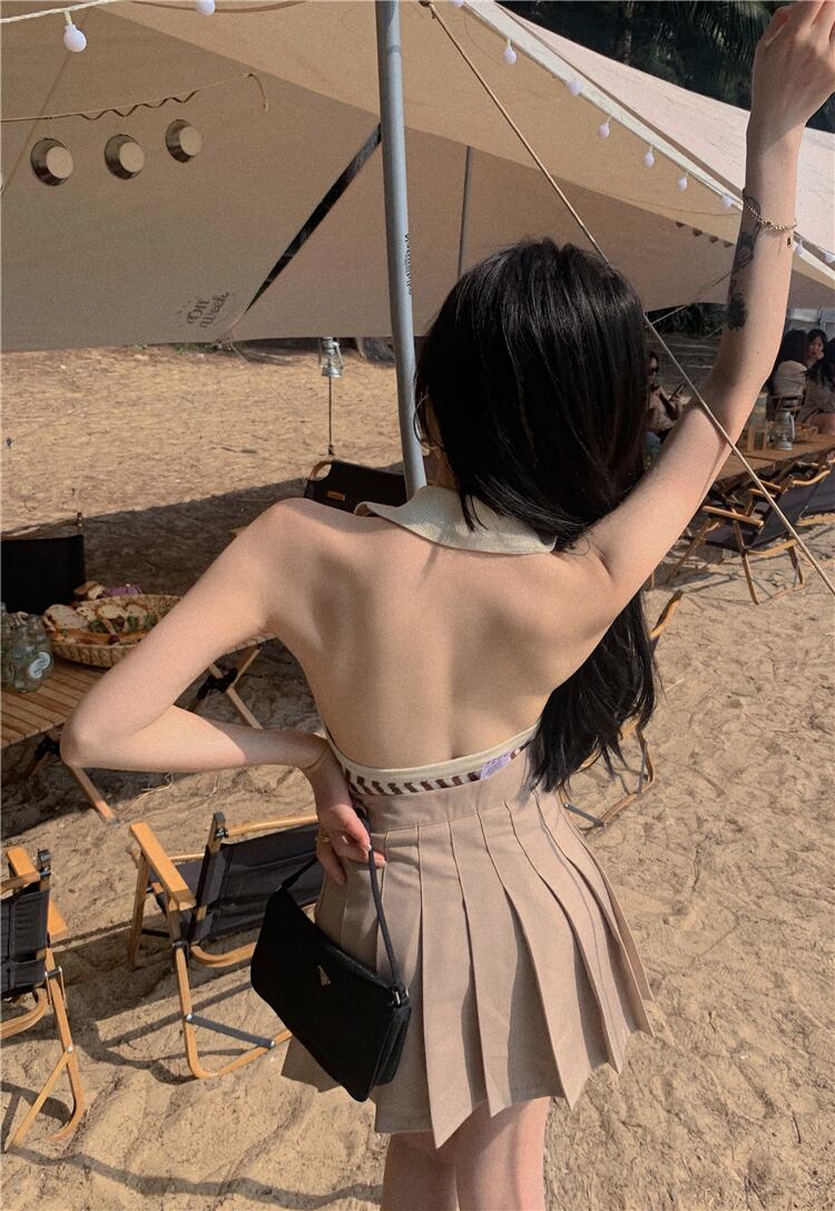 ストライプサマースタイルスリムノースリーブシャツ ショートホルタートップス 夏物 フラワークラフター72557908858