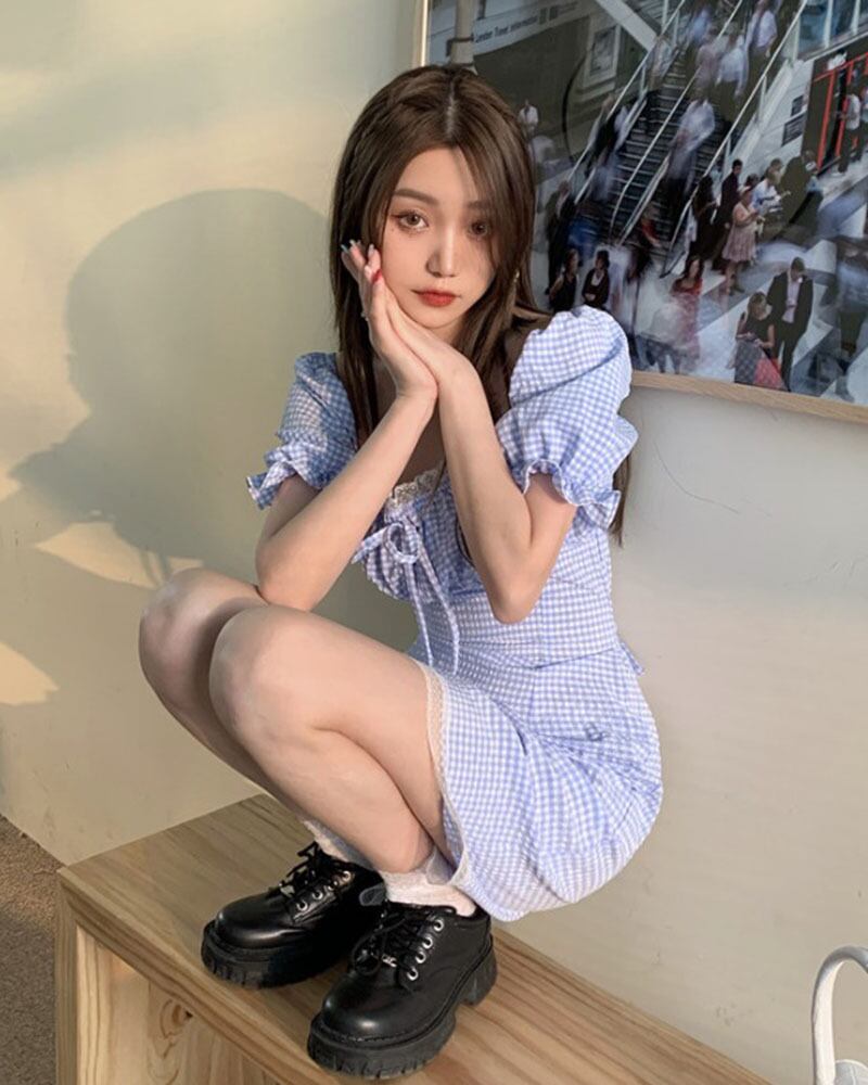 ドレス サマースタンダードウェスト格子柄スカート レースカラー レトロ 夏物 スクウェア ステッチ フラワークラフター49713248011
