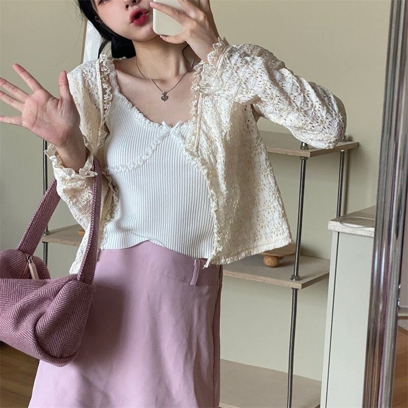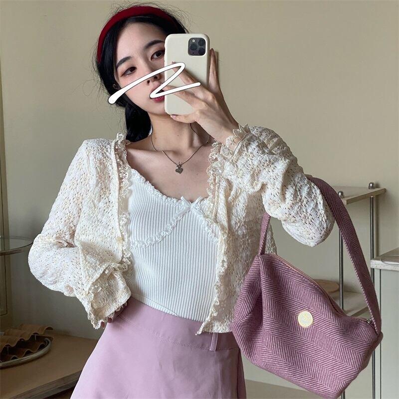 シフォンシャツ スプリングオータム薄手カーディガンレースクロップドトップス 春物 秋物 ステッチ フラワークラフター42407707408