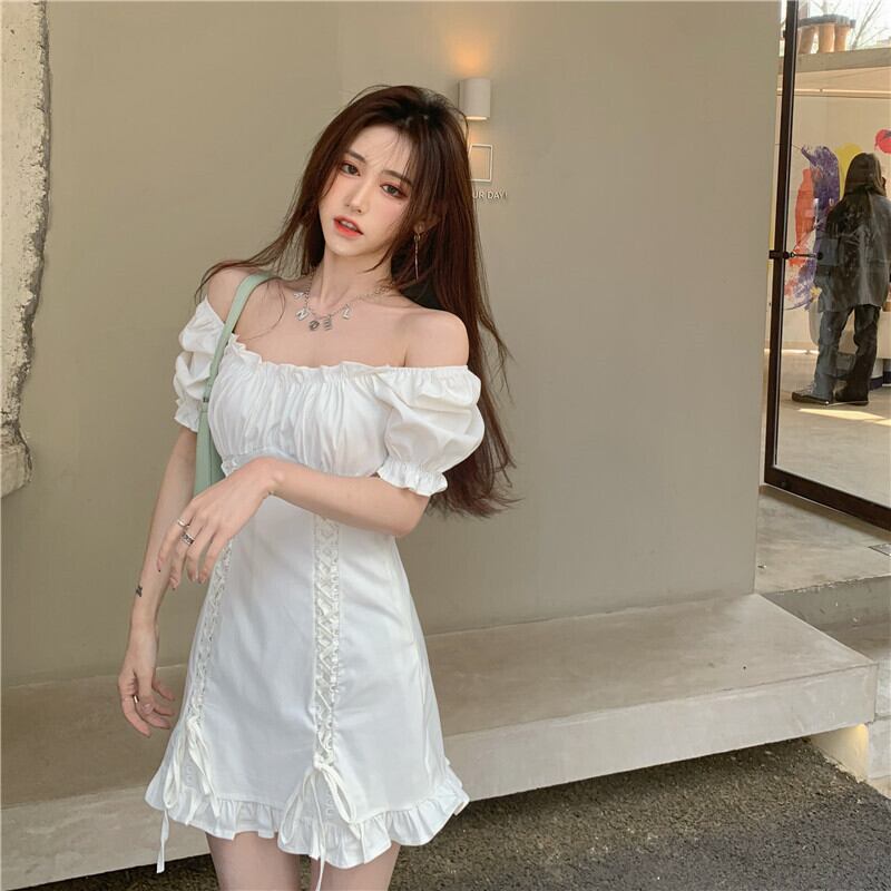 ホワイトドレス サマースタンダードスタイルカラースカート クロスウェストショート レトロ 夏物 スクウェア フラワークラフター72710741525