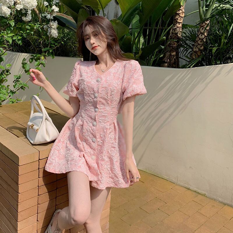 スリーブドレス サマースタンダードVネックスカート Aライン レトロ 夏物 フラワークラフター17110551933