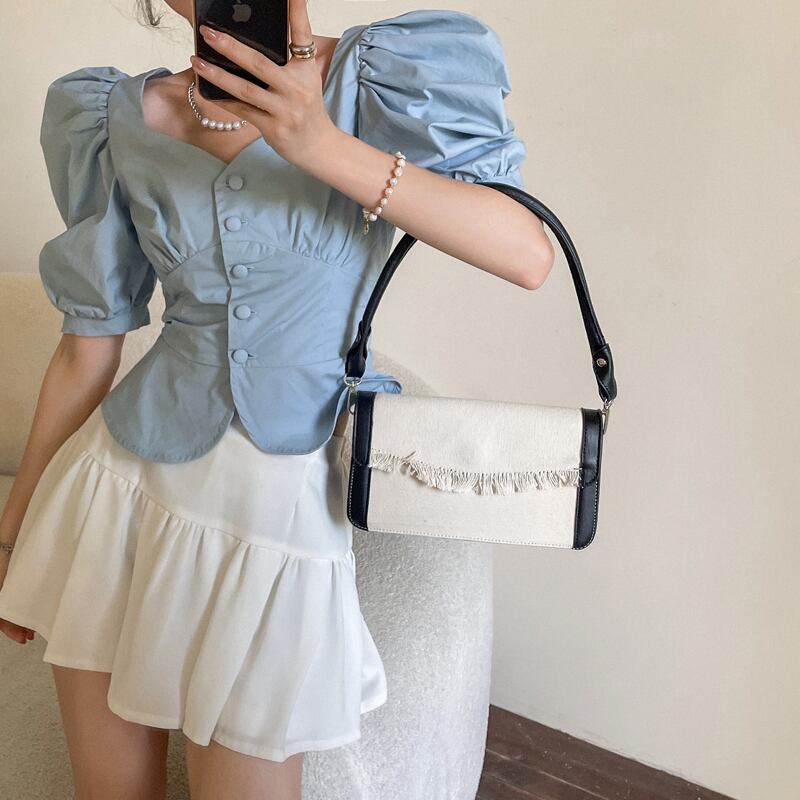 ブルースリーブシャツ サマーVネックスリムショートトップス 夏物 フラワークラフター82368110527