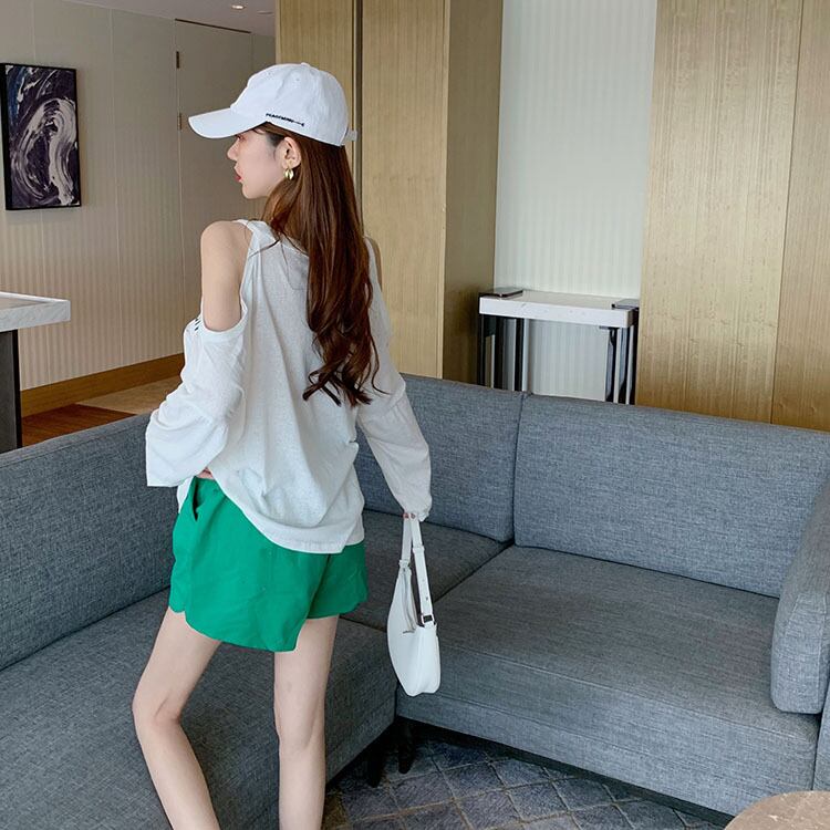 色:ホワイトトップシングルピース,緑色のショートパンツ