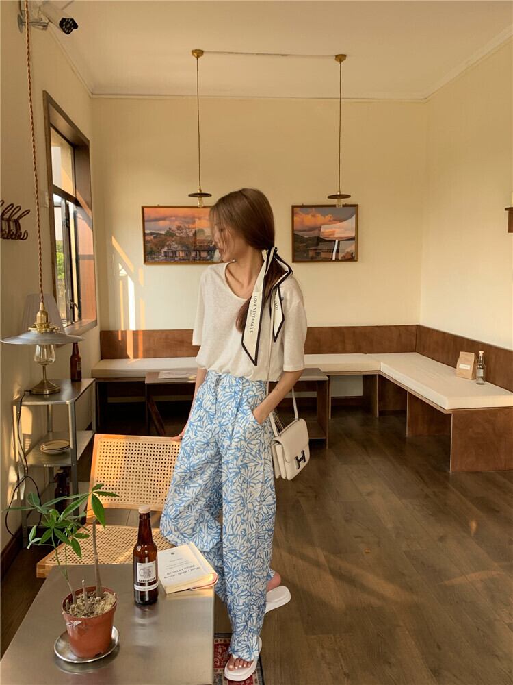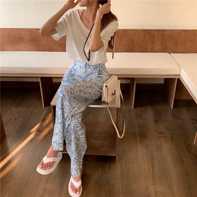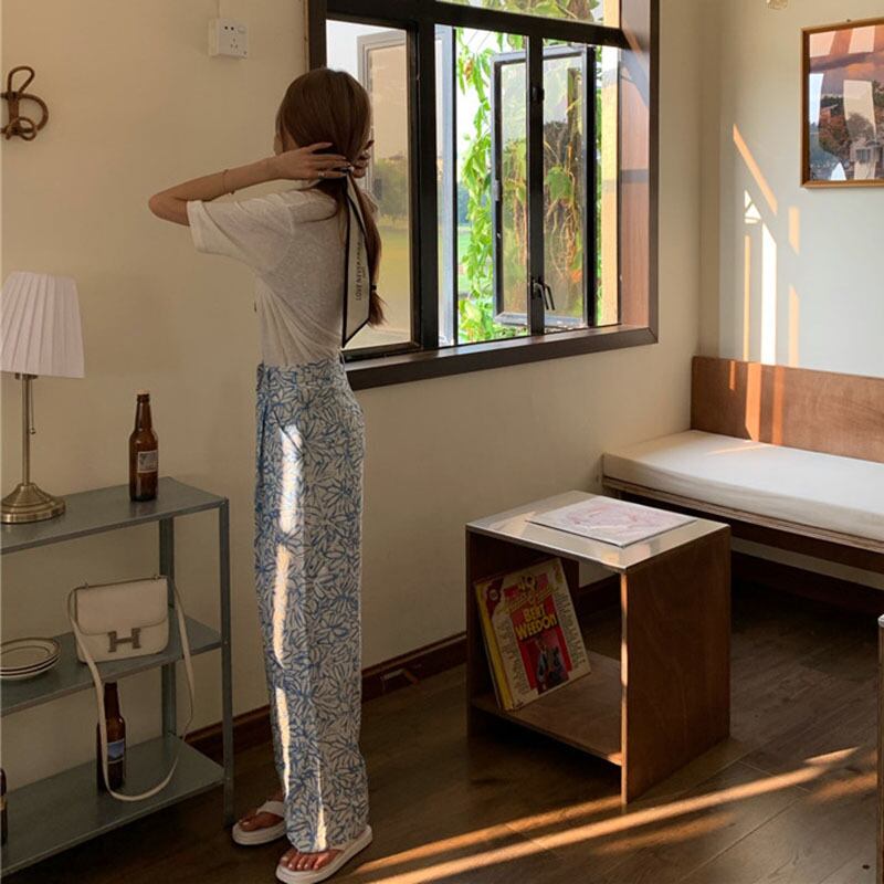 ブルーフローラルカジュアルパンツ サマールーズレッドハイウェスト薄手 夏物 花柄 フラワークラフター69959285036