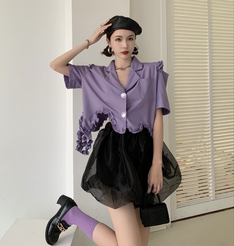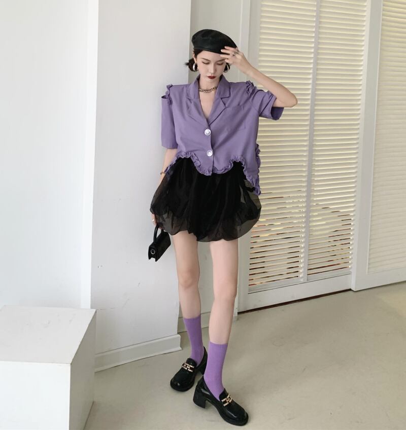 色:パープルジャケットワンピース,ブラックメッシュパンツ