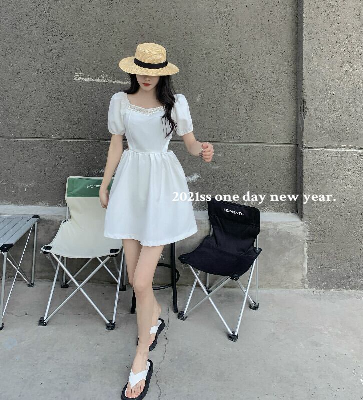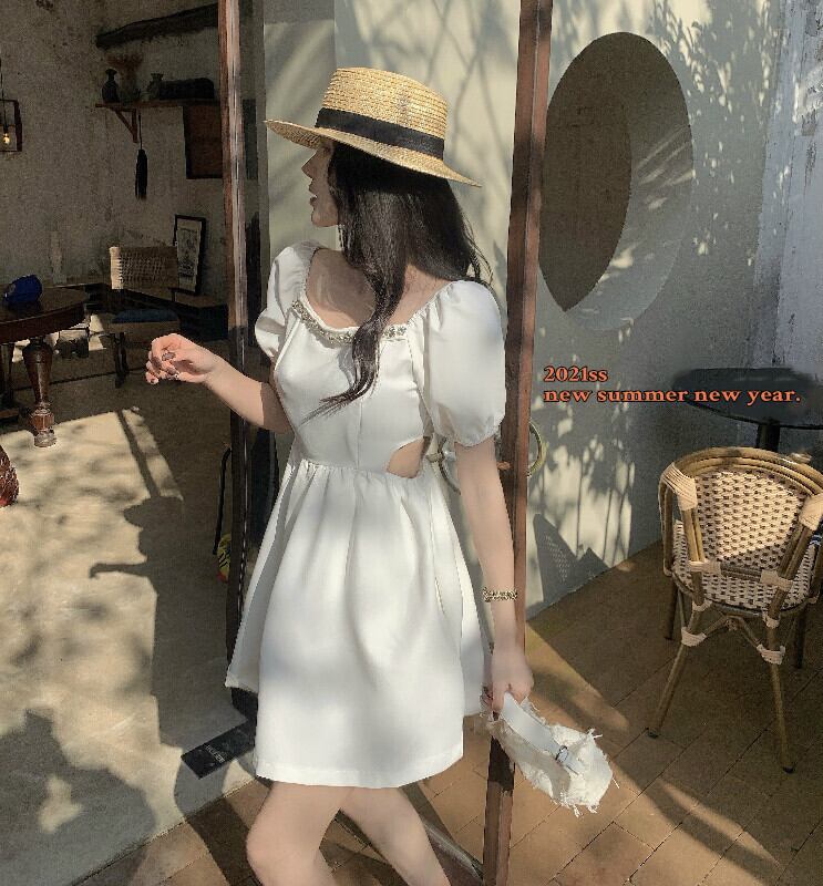 ブラックスリーブドレス サマースタイルカラーウェストスリムスカート 夏物 スクウェア フラワークラフター26042649725