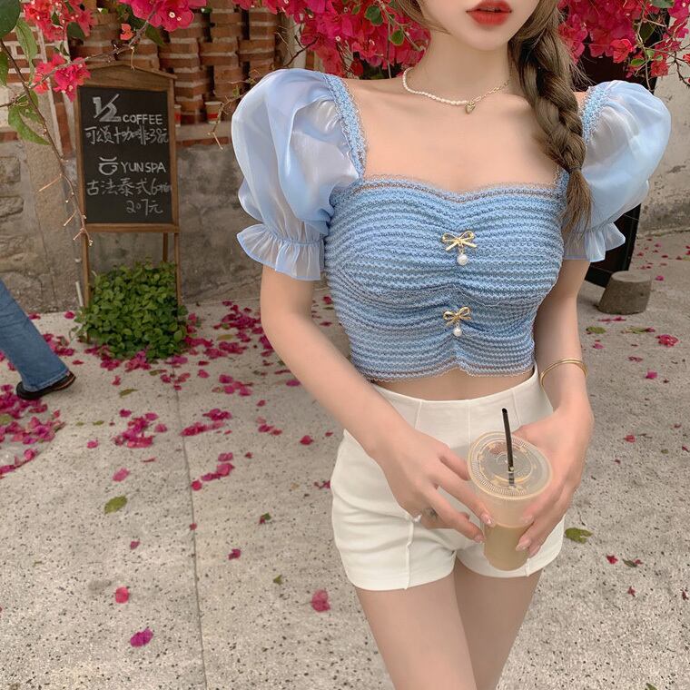ブルーシャツ レディースサマースタンダードリボンスリムクロップドクロップトップ トップス レトロ 夏物 フラワークラフター30589035547