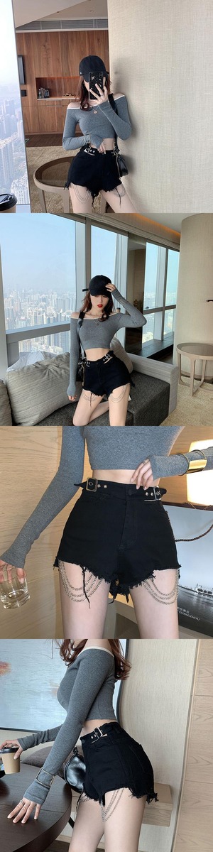 ショーツ ルーズスプリングブラックパンツ スタイルチェーン ハイウェストウェストワイドレッグ 春物 ブルマー ワイドパンツ フラワークラフター39737026926