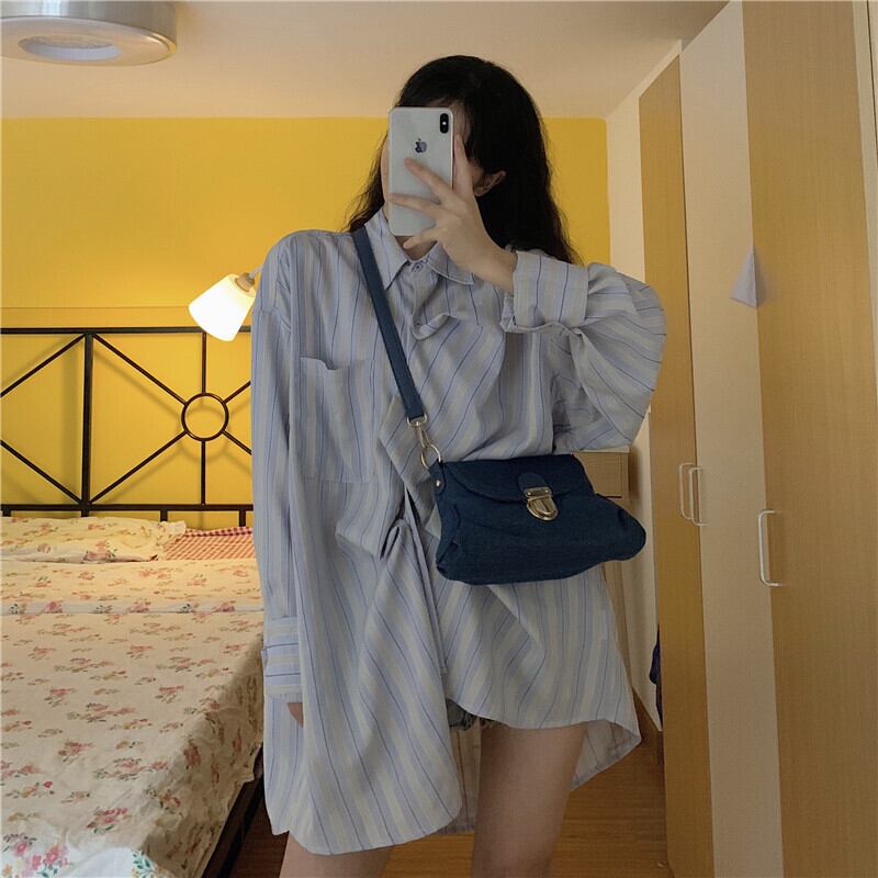 ストライプシャツ スプリングルーズロングトップス 春物 フラワークラフター9367880322