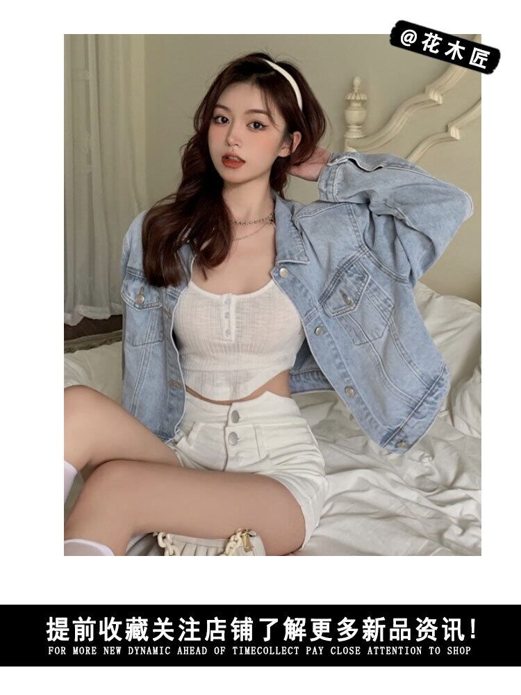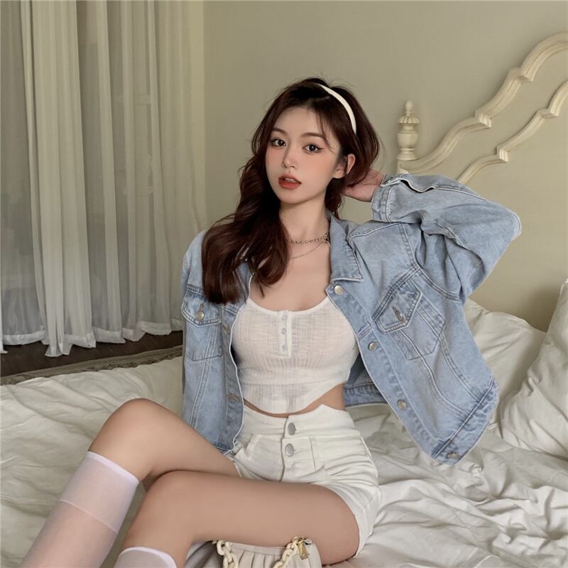 色:デニムジャケットワンピース,白いショーツの単一部分,シングルホワイトベースシャツ