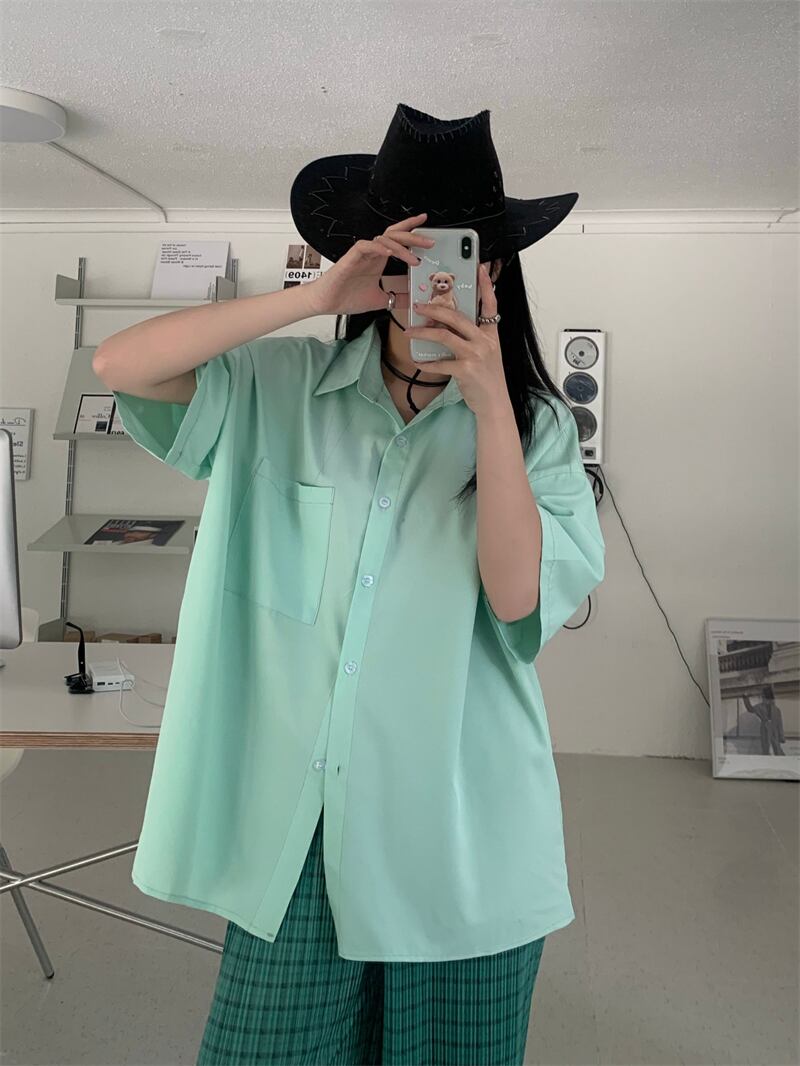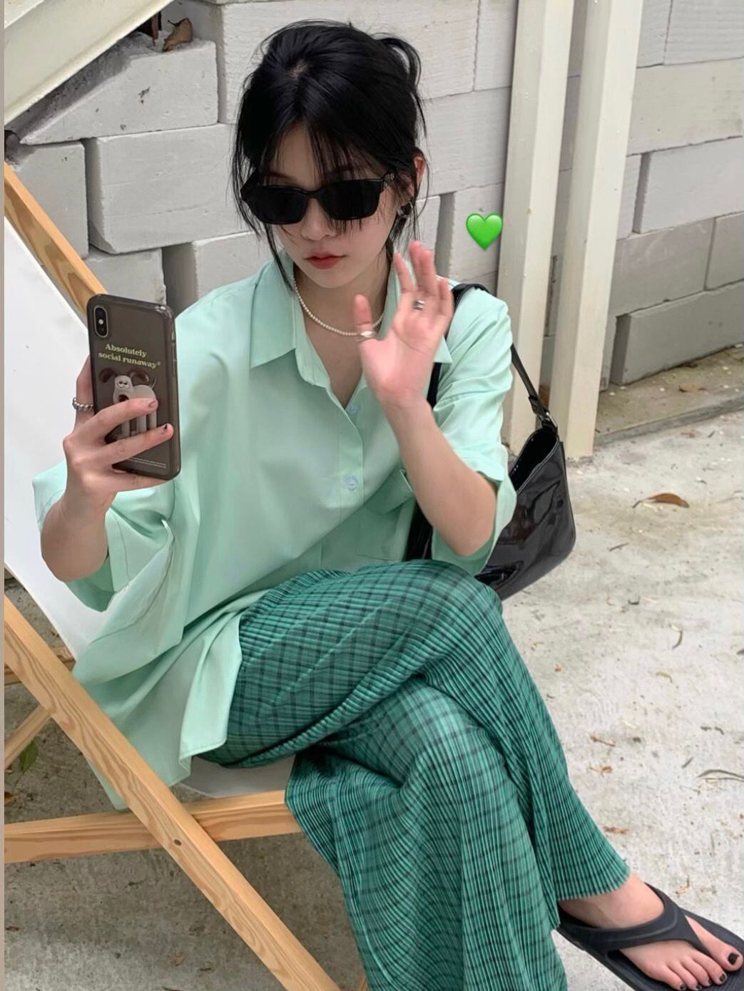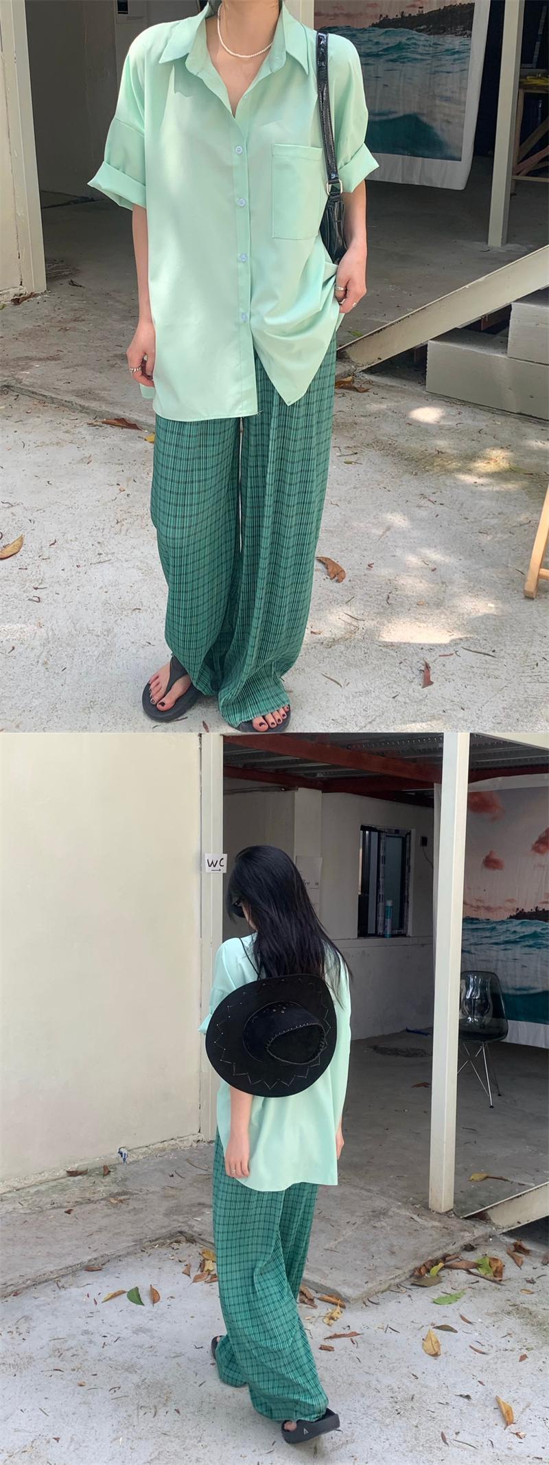 色:緑のシャツワンピース,プリーツパンツ一枚