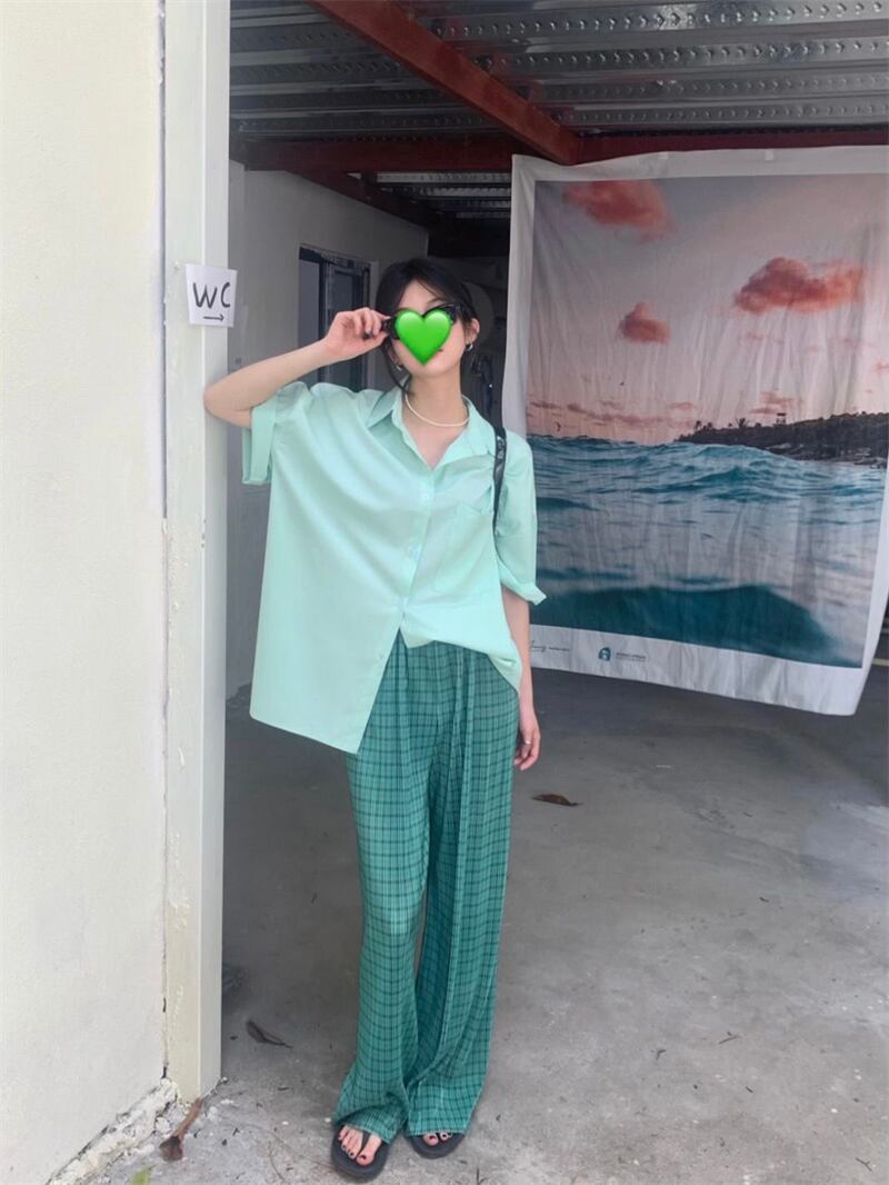 グリーン格子柄カジュアルパンツ ルーズサマーハイウェスト薄手 夏物 フラワークラフター83356469615