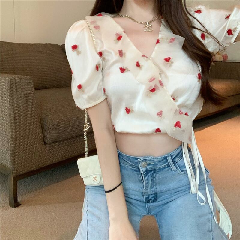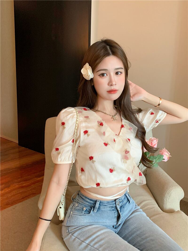 刺繍メッシュシャツ サマーVネックレースショートトップス 夏物 フラワークラフター15669870053