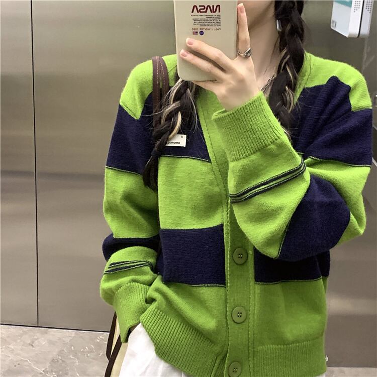 ストライプニットカーディガンスプリングオータムVネックルーズ薄手 ロング 春物 秋物 フラワークラフター56235453144