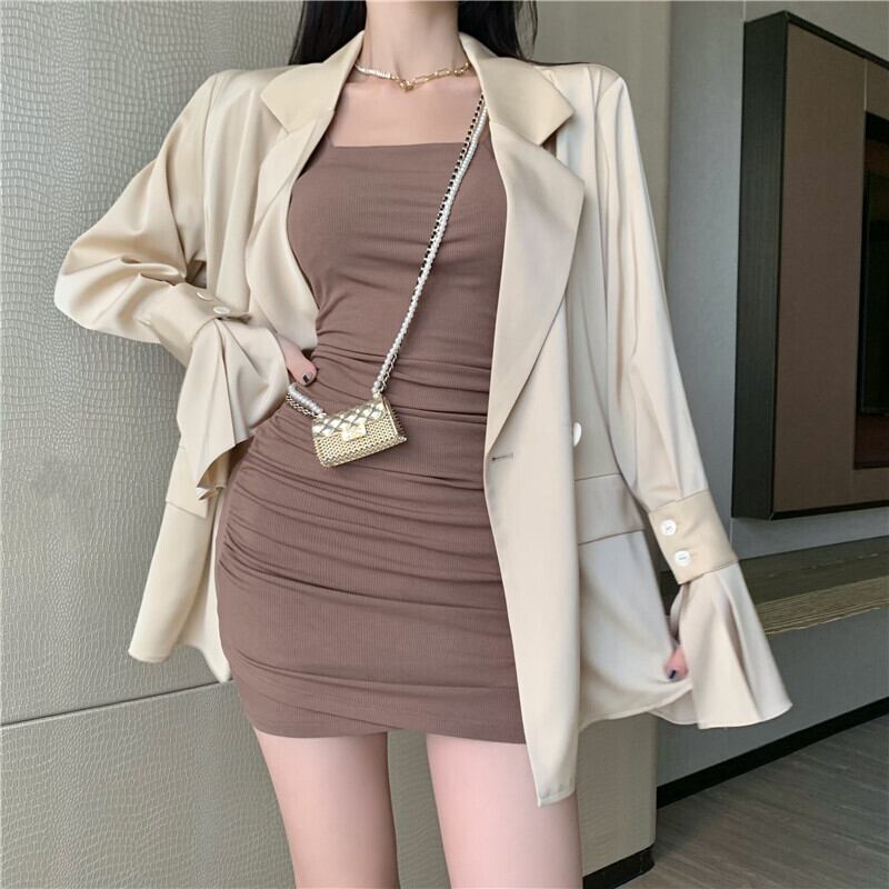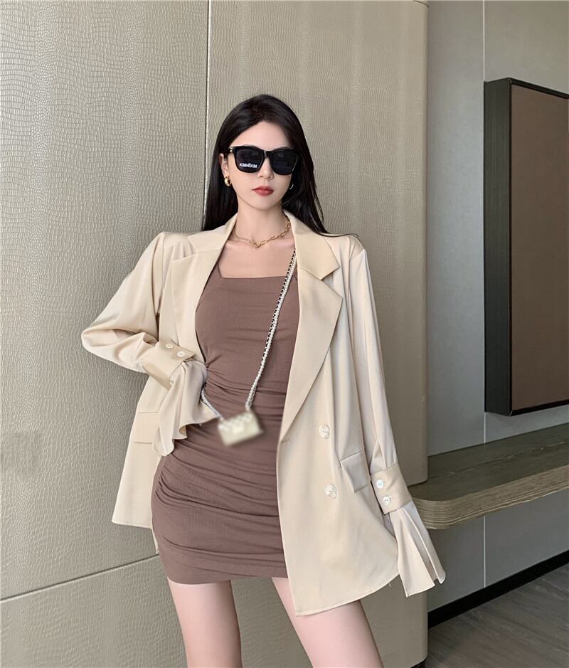 色:シャンパンイエロージャケット,茶色のスカートワンピース