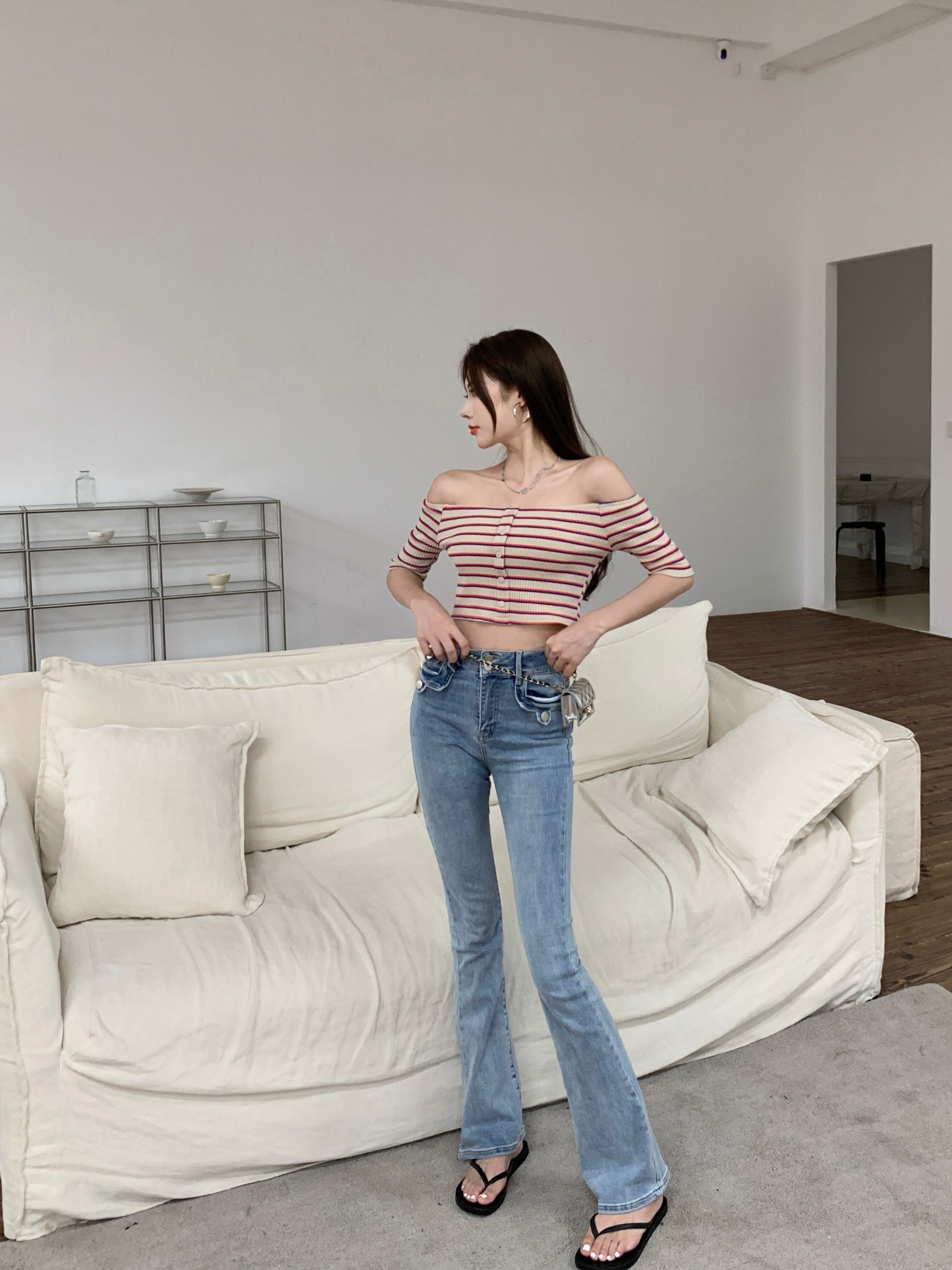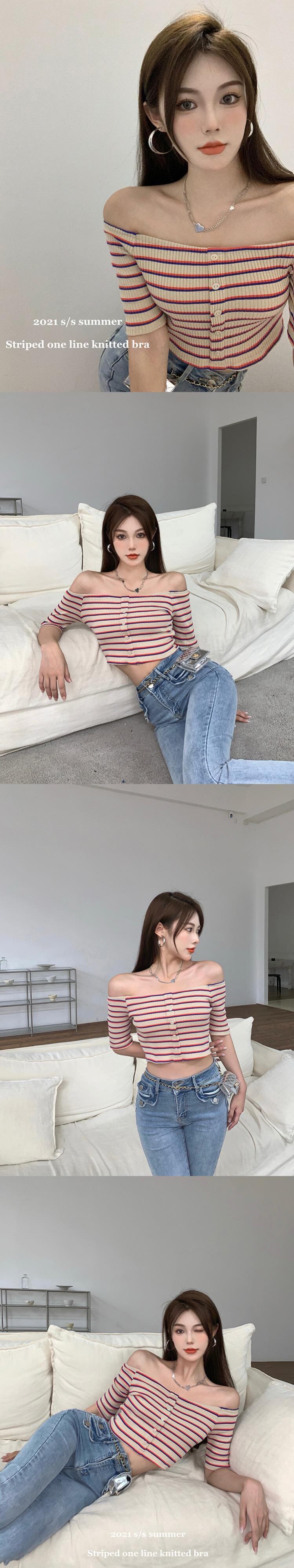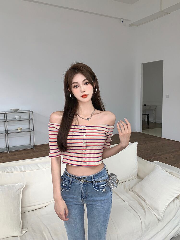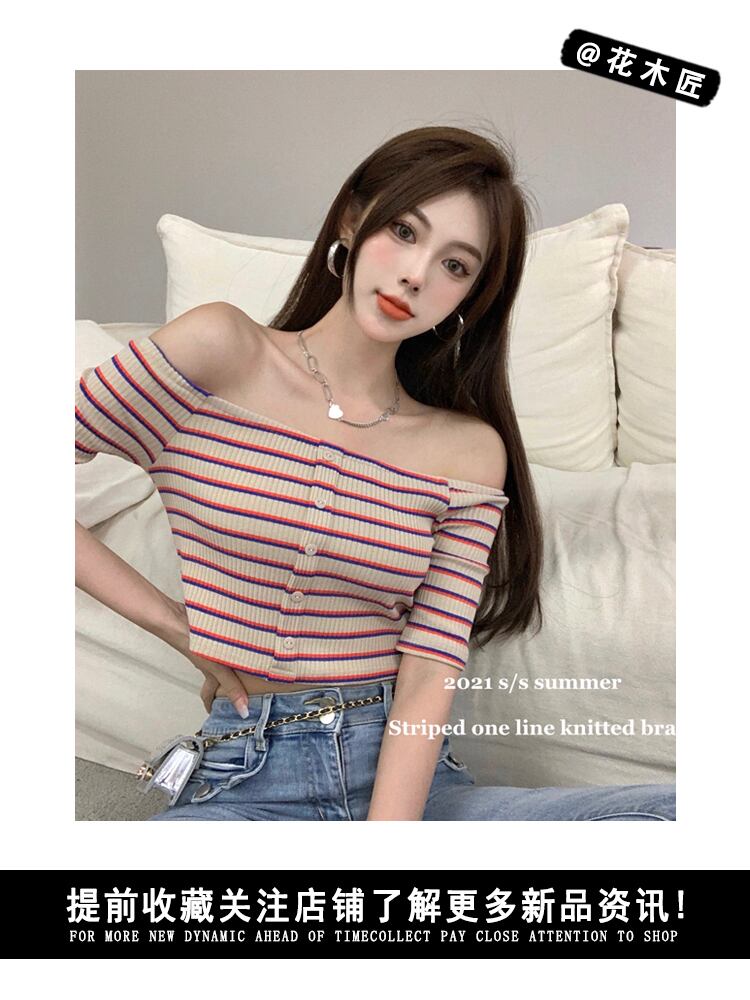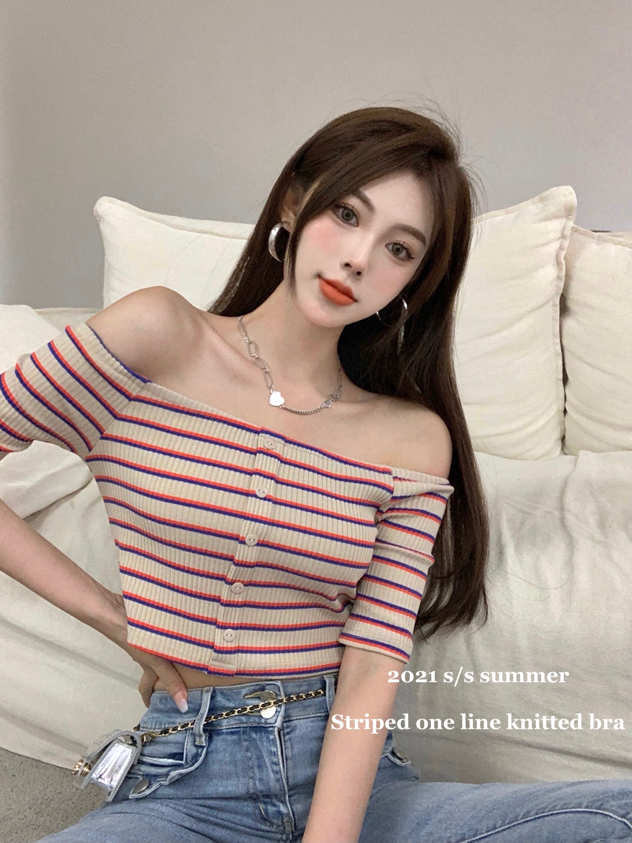 ストライプニットTシャツ サマーストラップレストップス 夏物 フラワークラフター33627975135