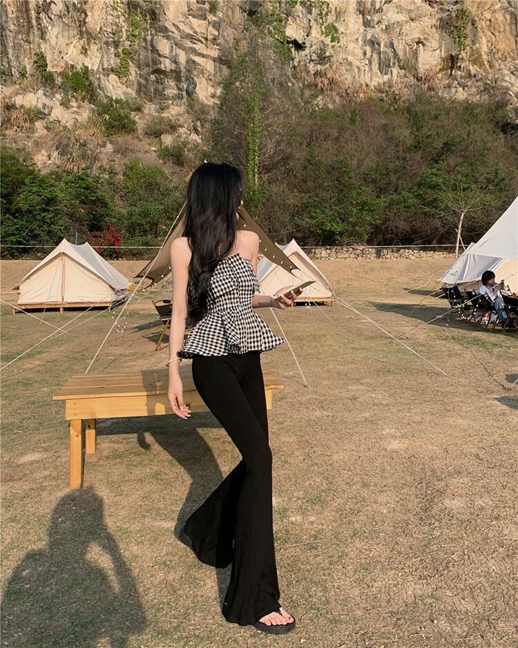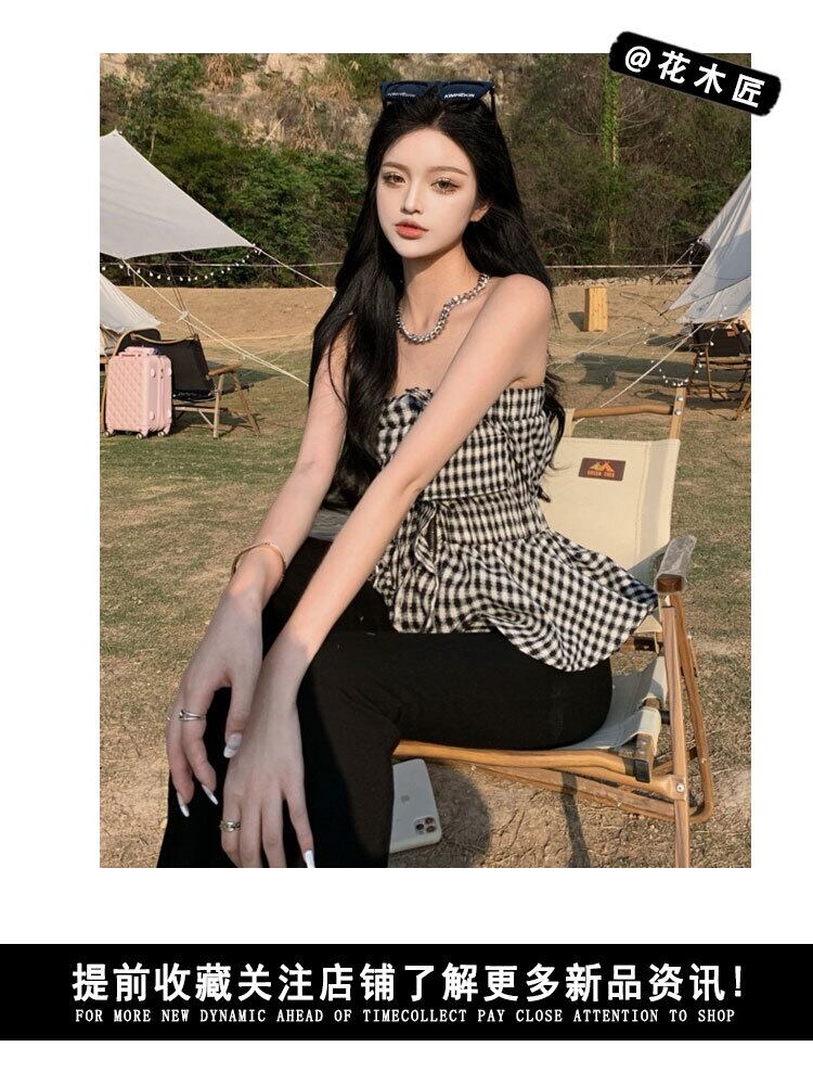 格子柄トップス ストラップレスサマースリムショート 夏物 フラワークラフター74991847870