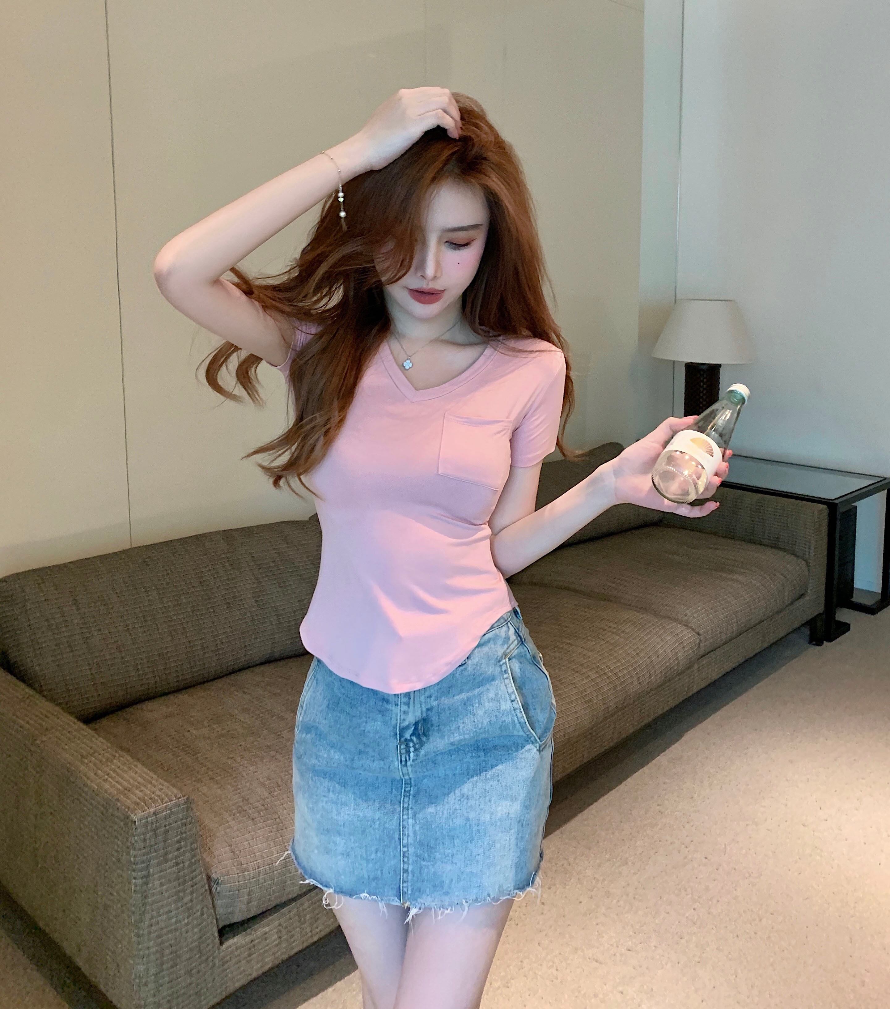ホワイトショートTシャツ サマーVネックスリムレッドトップス 夏物 フラワークラフター95969390194