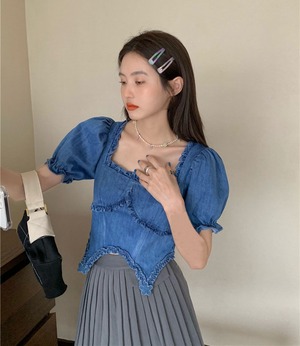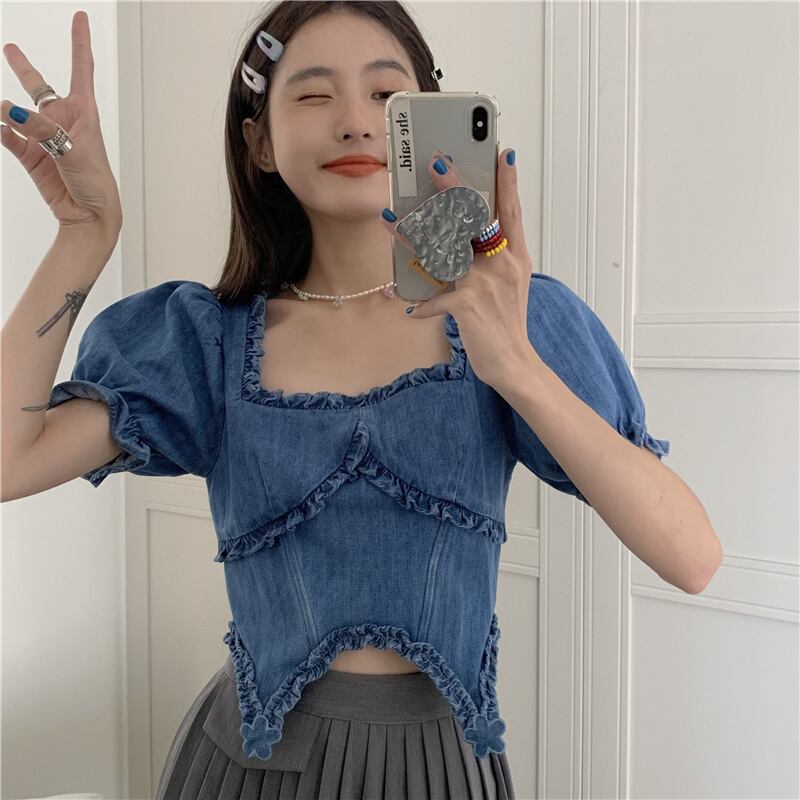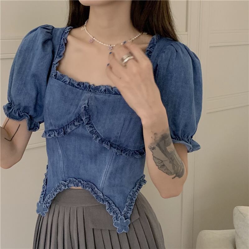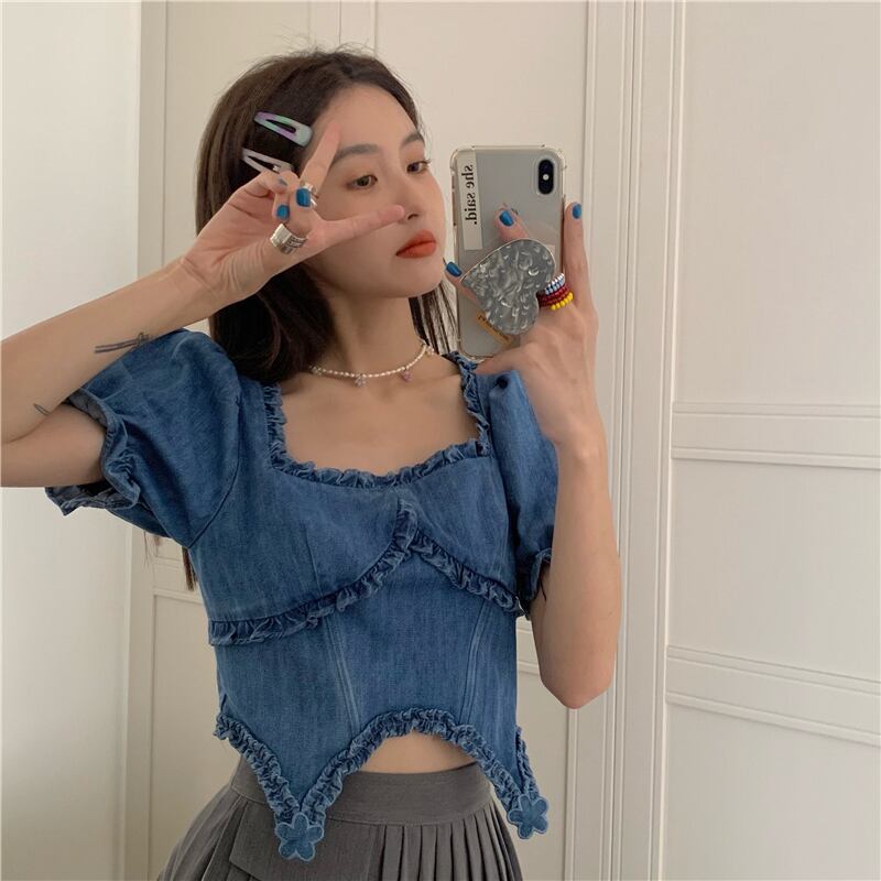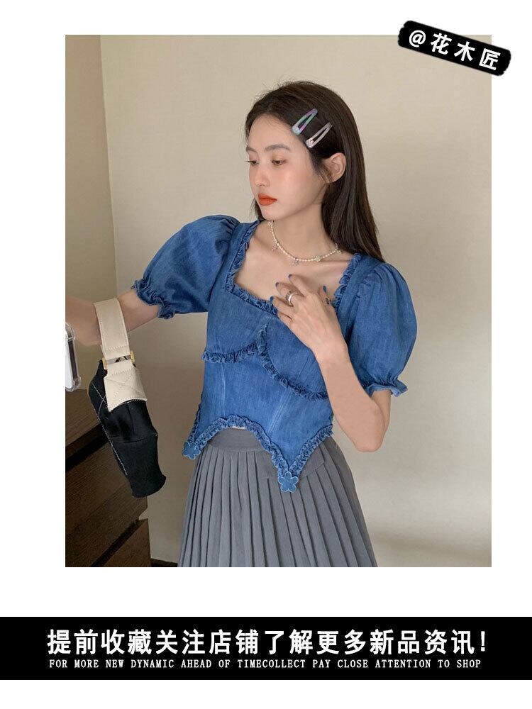 スリーブトップス サマーカラースリムレースショートシャツ 夏物 スクウェア フラワークラフター10225667179