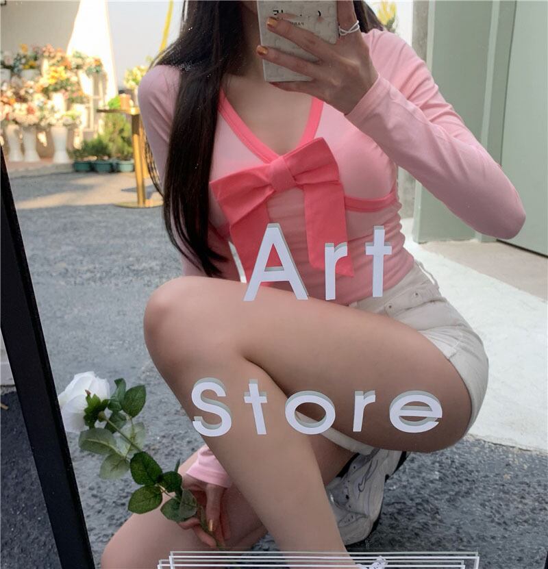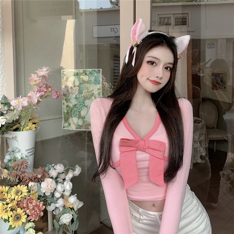 Tシャツ スプリングオータムレッドVネックスリムショートトップス ロング 春物 秋物 フラワークラフター68380315683