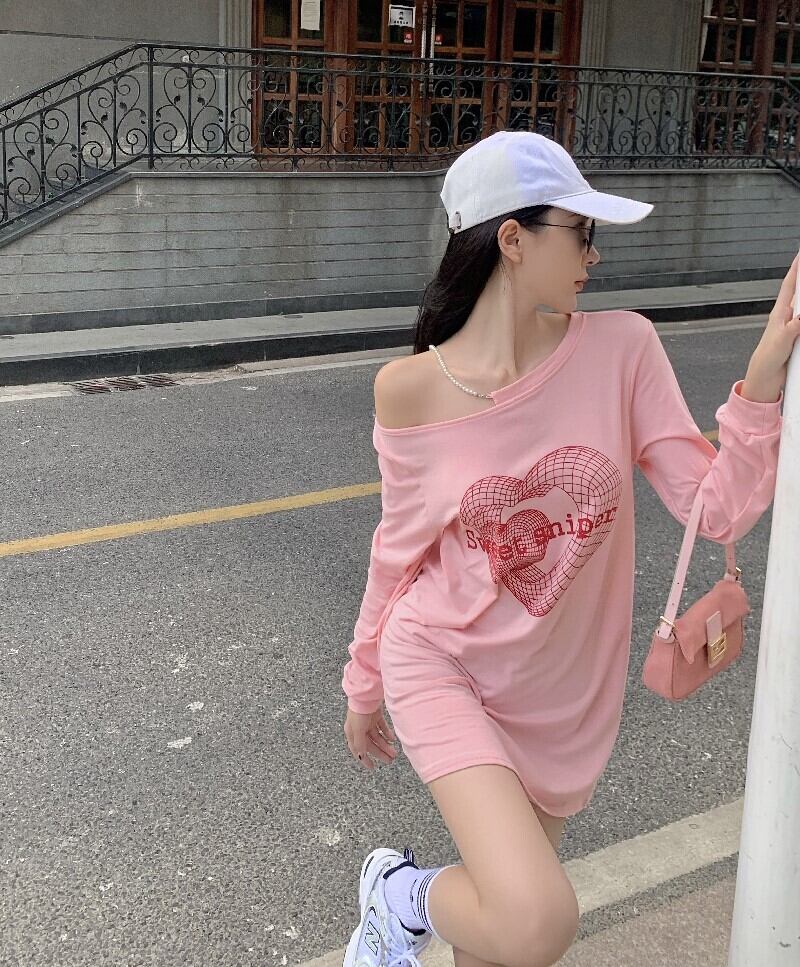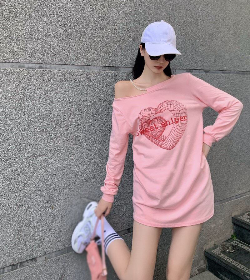 プリント長袖スリーブTシャツ レディースサマーストラップレスルーズトップス ロング ピンク 夏物 フラワークラフター69387965745