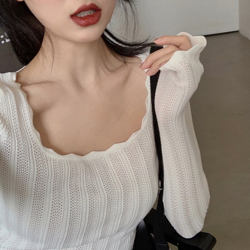 薄手ニットセーター レディーススプリングスリムホワイトシャツ ショートトップス ロング 春物 スクウェア フラワークラフター90977707622