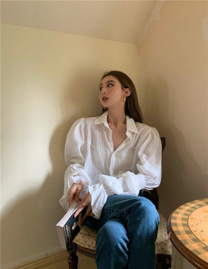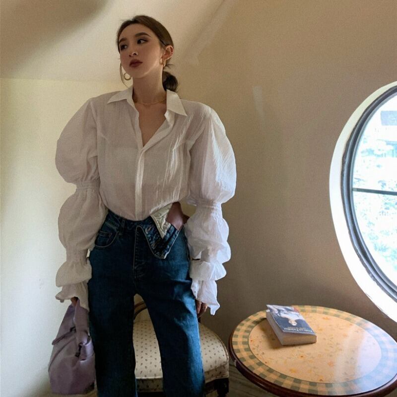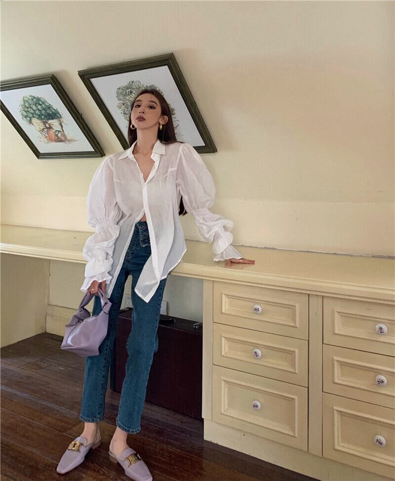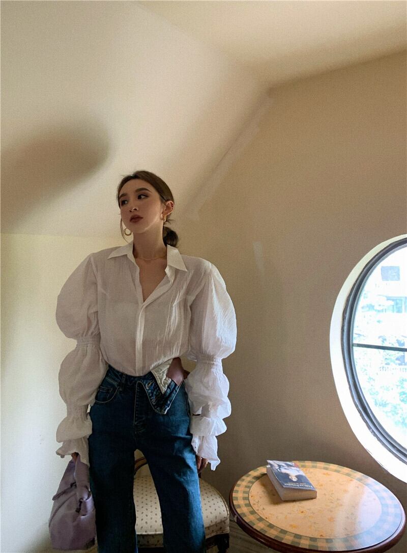 ホワイトシャツ レディースサマースリーブ ランタンスリーブ 夏物 フラワークラフター92666041610