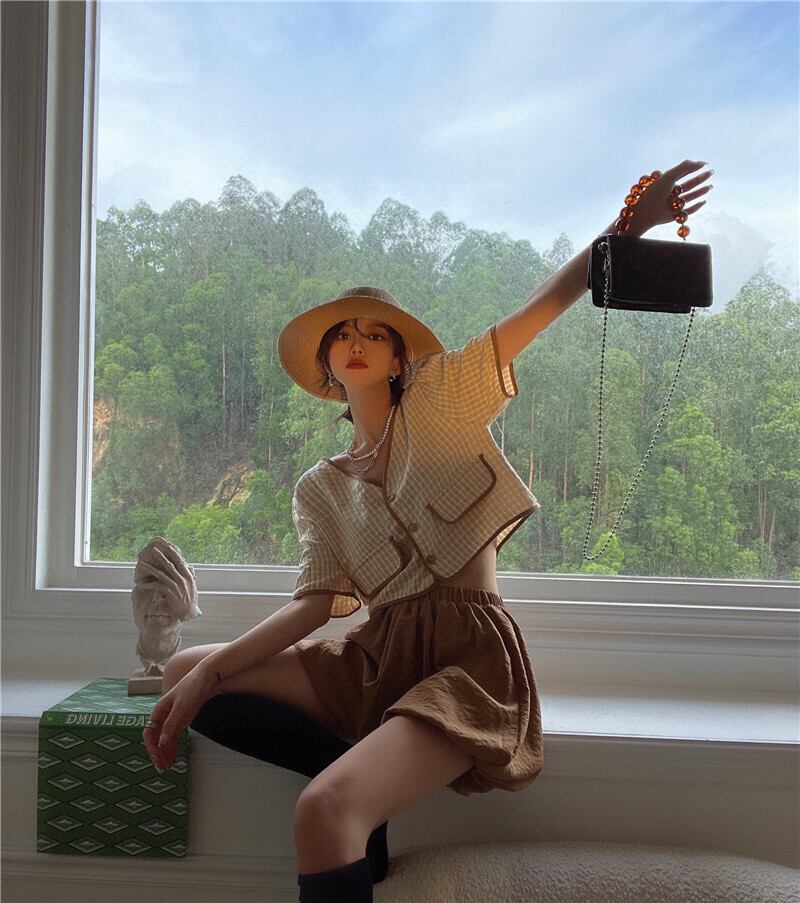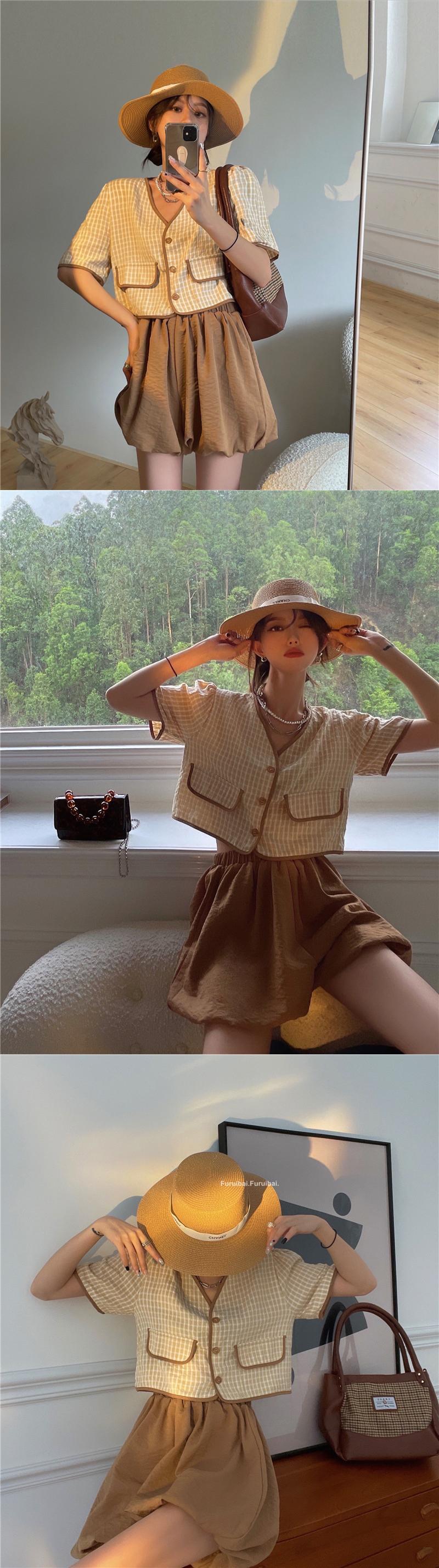 スタンダード格子柄ショートシャツ サマーカラーVネックスタイルトップス レトロ 夏物 フラワークラフター94882958632