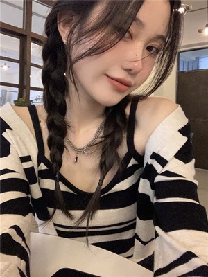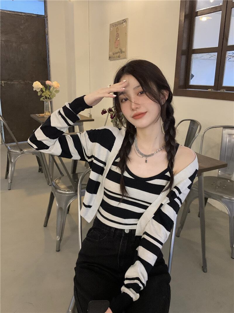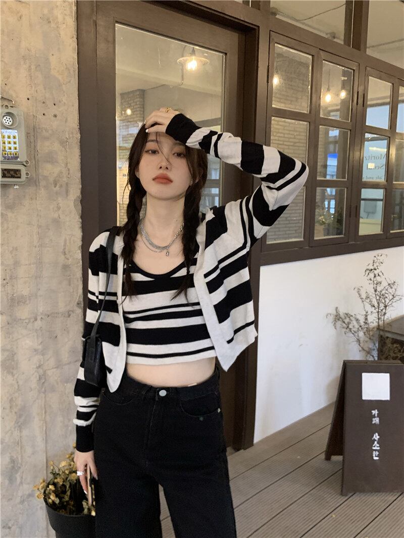 ストライプニットカーディガンサマースタイルカジュアルショートトップス 夏物 フラワークラフター92444536606