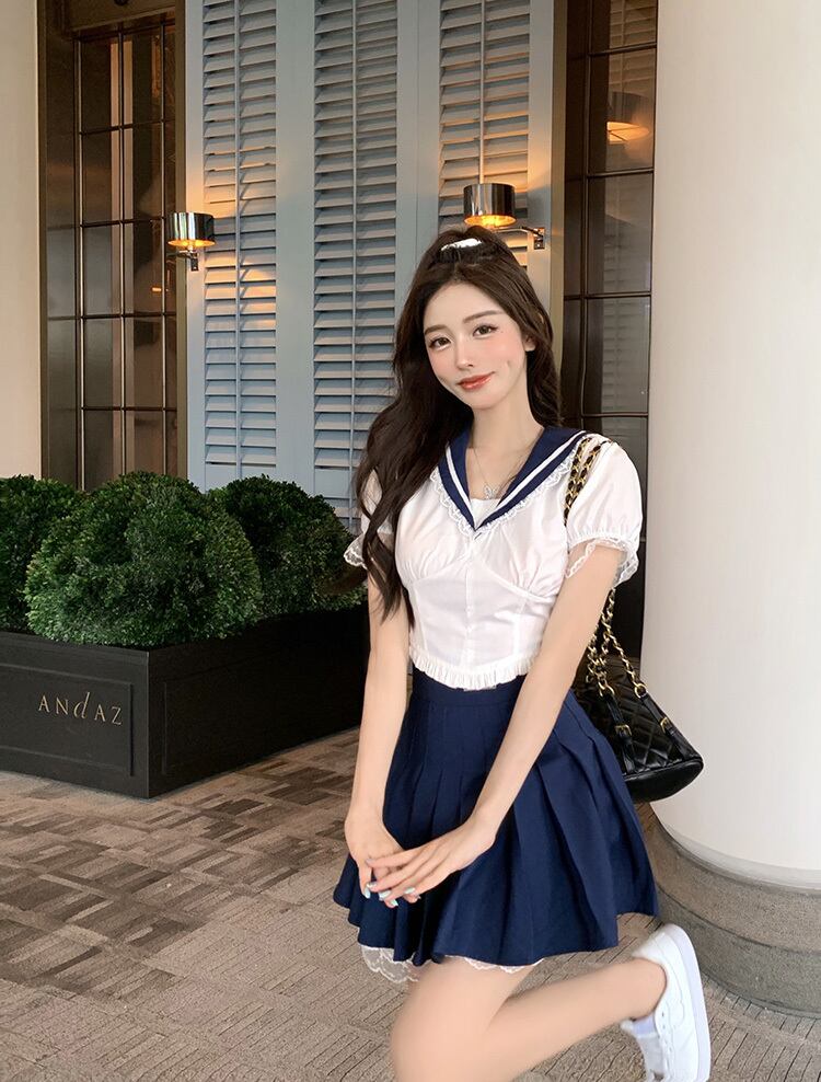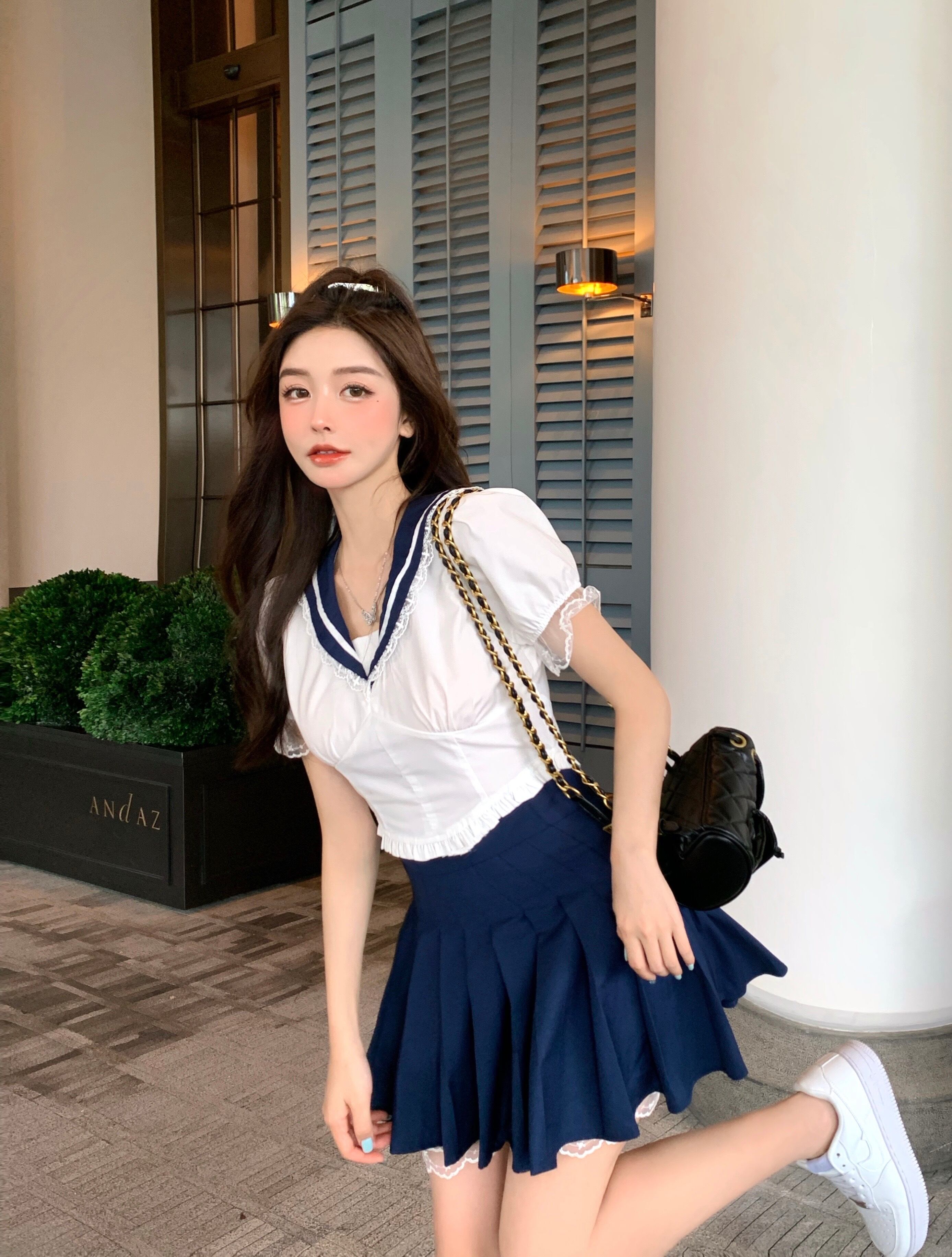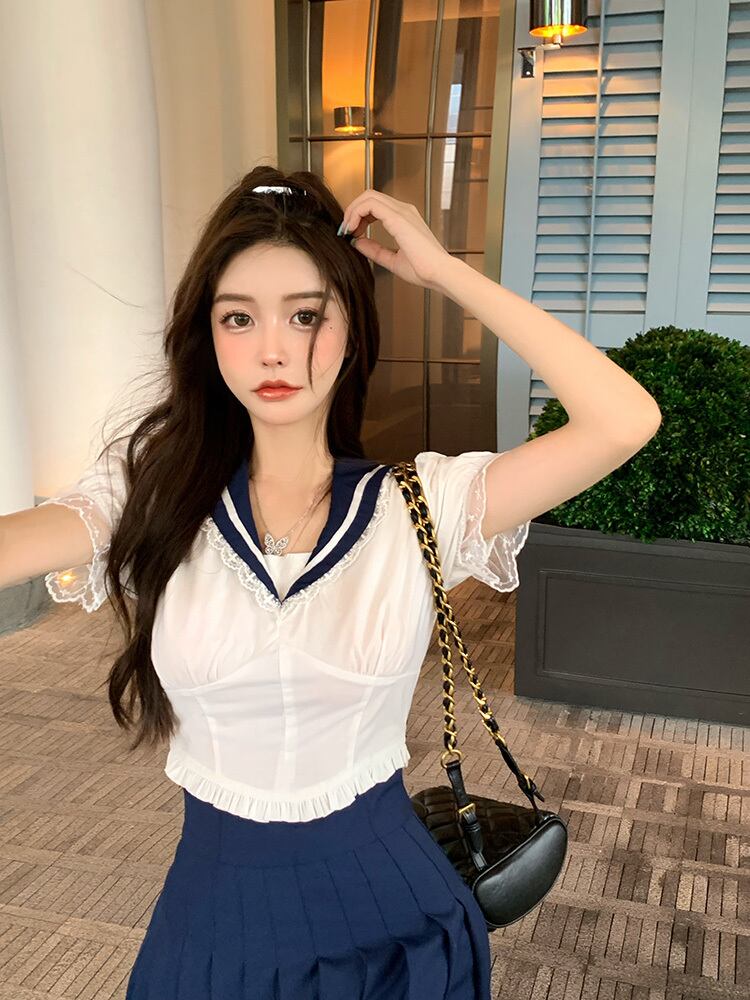 カラーネイビーショートシャツ レディースサマースタイルレーストップス 夏物 フラワークラフター94977639008