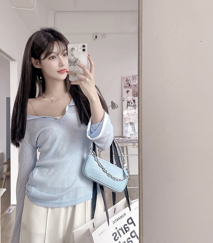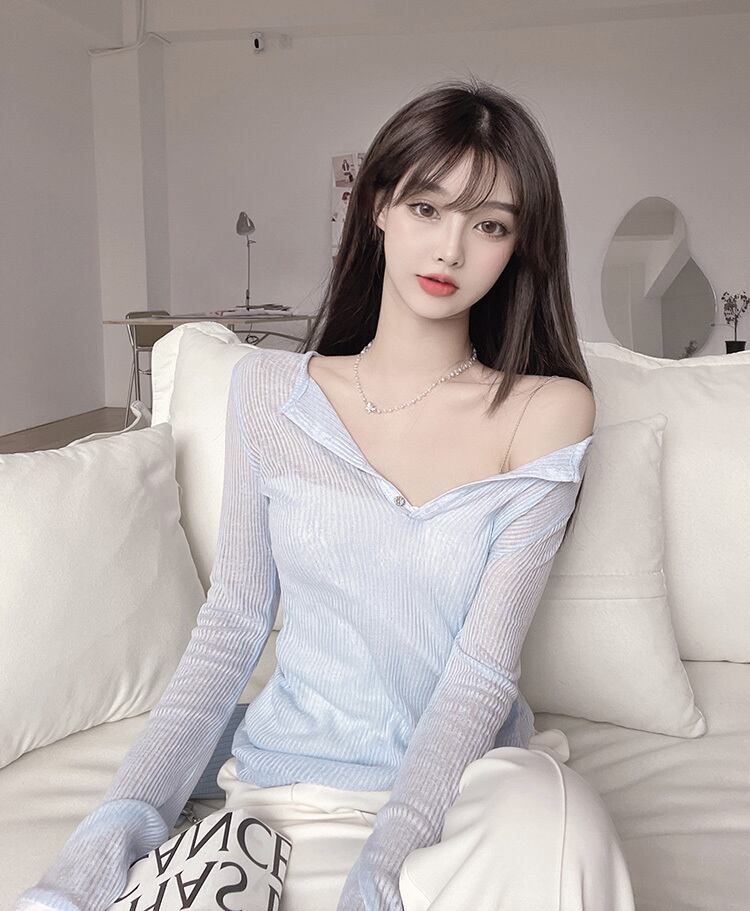 ブルーセーター サマー薄手ブラウス スリム ロング 夏物 フラワークラフター96571921366