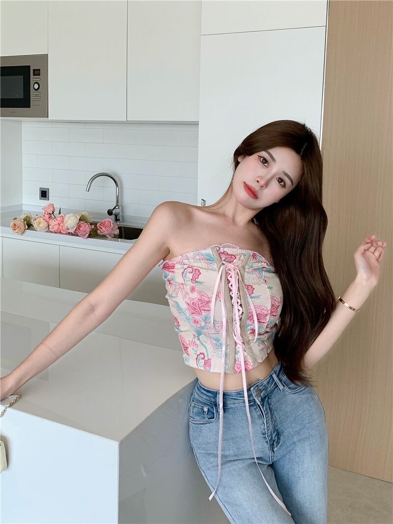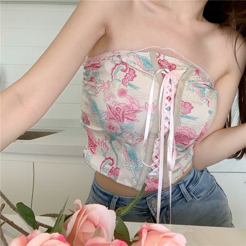 スタンダードプリント柄トップス レディースサマーレースストラップ スリム レトロ 夏物 フラワークラフター83968497258