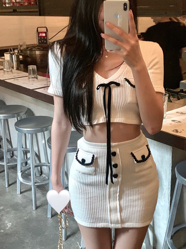 カラーニットショートTシャツ レディースサマーVネックスリムトップス 夏物 フラワークラフター19397768141
