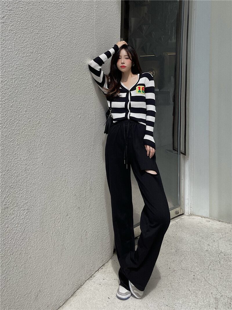 色:ブラックストライプトップ,グリーンストライプトップ,ブルーストライプトップ,単一の白いズボン,黒いズボン,グレーのズボン