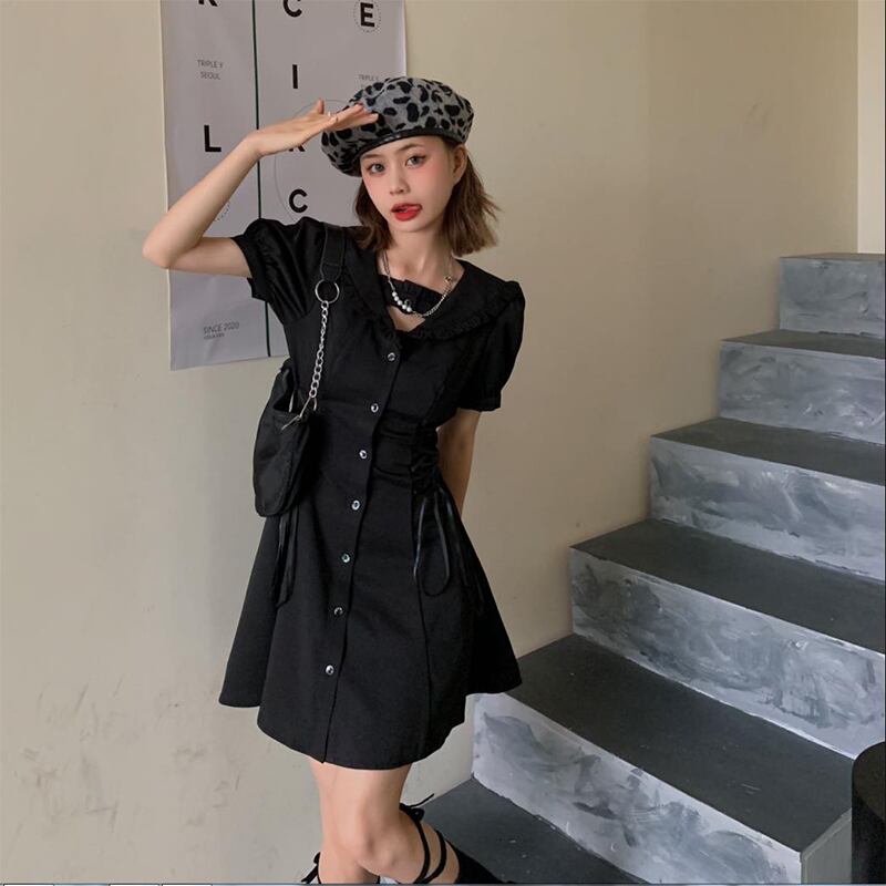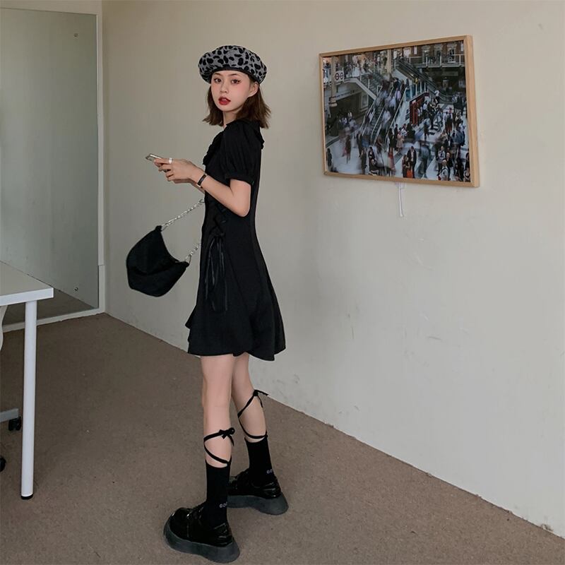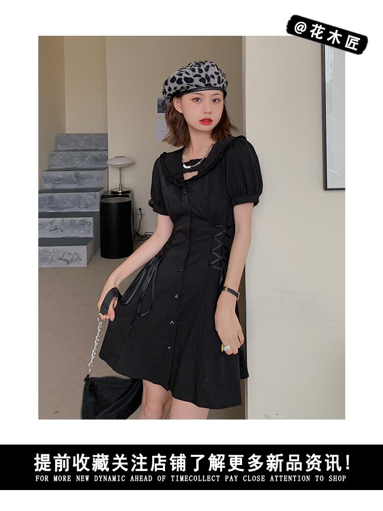 スタンダードスリーブドレス サマースタイルブラックウェストAラインショートスカート レトロ 夏物 フラワークラフター25952841938
