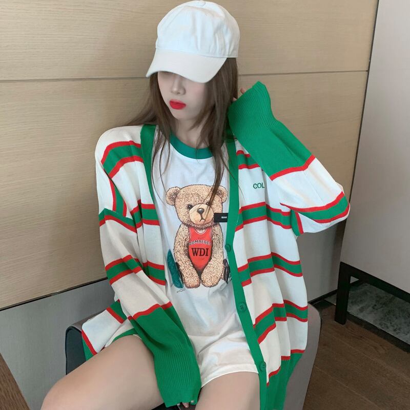 レッドストライプセーター スプリングサマーVネックボタンカーディガンルーズトップス ロング 春物 夏物 フラワークラフター8321973254