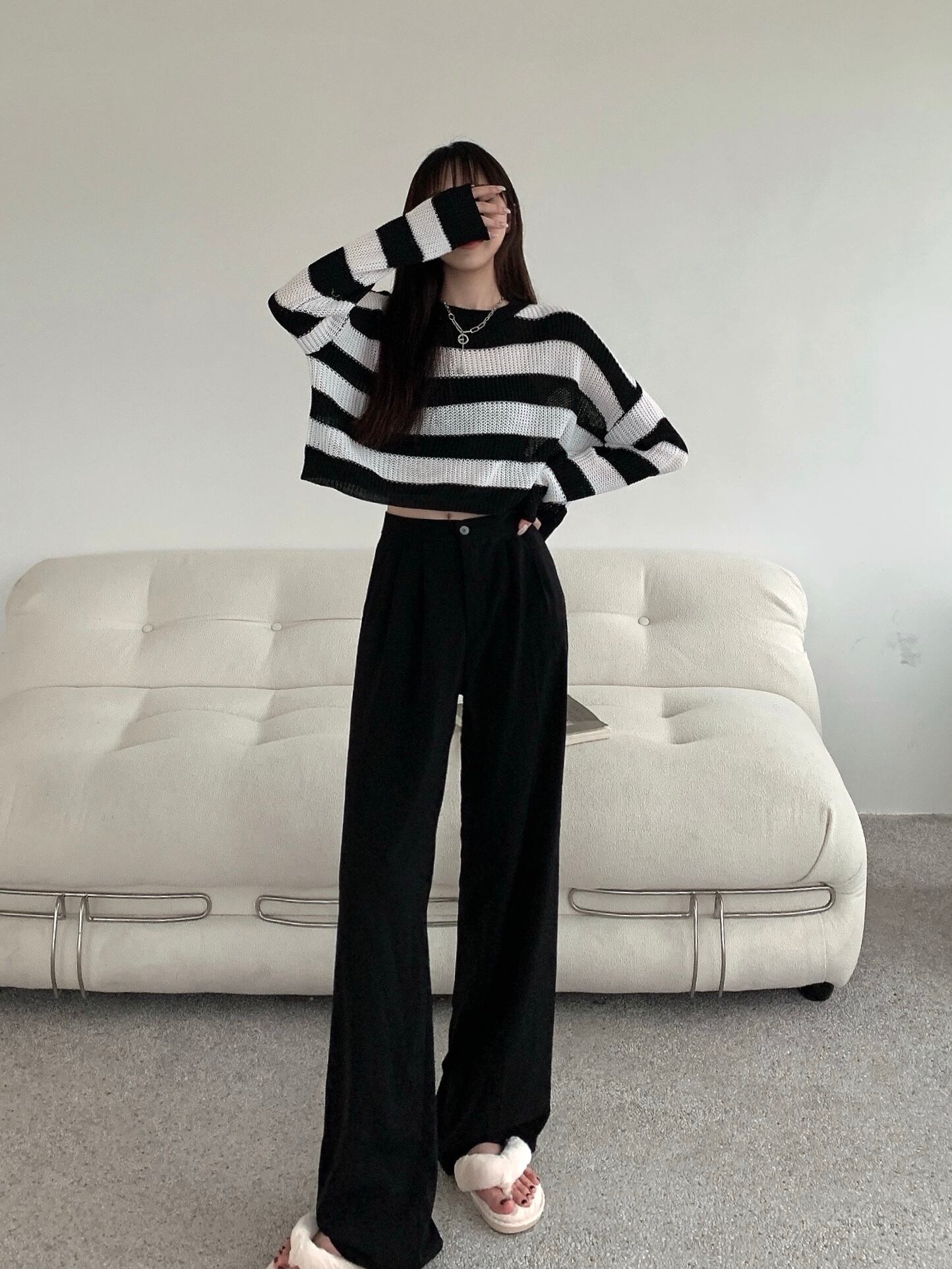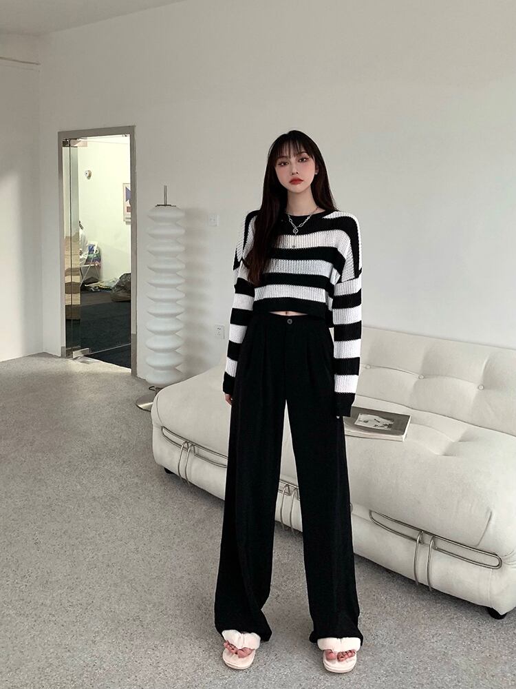ストライプセーター スプリングオータムスタンダードルーズスタイルカジュアルショートトップス ロング レトロ 春物 秋物 フラワークラフター88653045956
