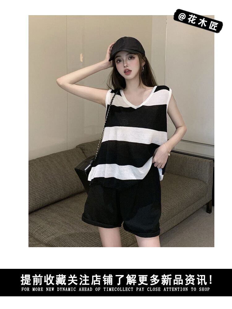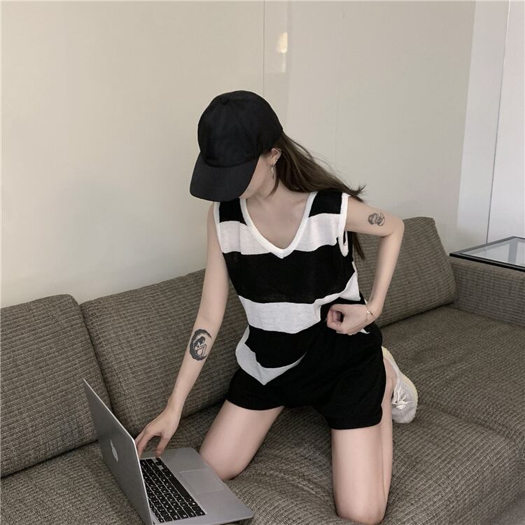 ストライプニットレディースサマーレッドスタイルVネックバックルーズトップス 夏物 フラワークラフター88979010698