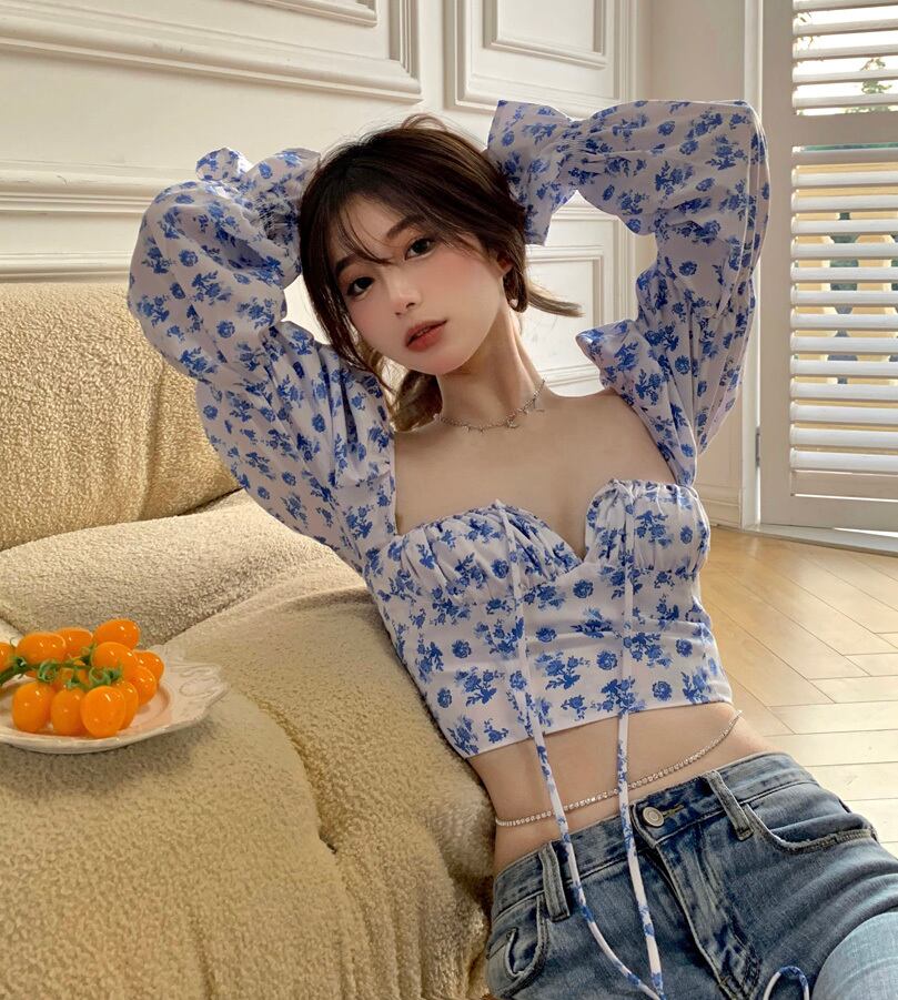ブルーフローラルシャツ サマースタイルスリムショートトップス ロング レース 夏物 花柄 レースアップ スクウェア フラワークラフター57826455482