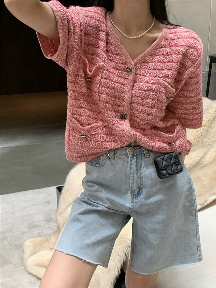 ニットカーディガンサマーレッドルーズスタイル薄手トップス ピンク 夏物 フラワークラフター92362913106