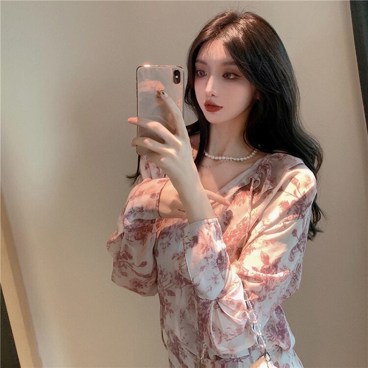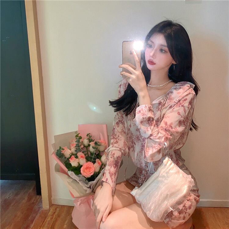 フローラルシフォンシャツ サマー薄手ルーズトップス ロング 夏物 花柄 フラワークラフター85339328161