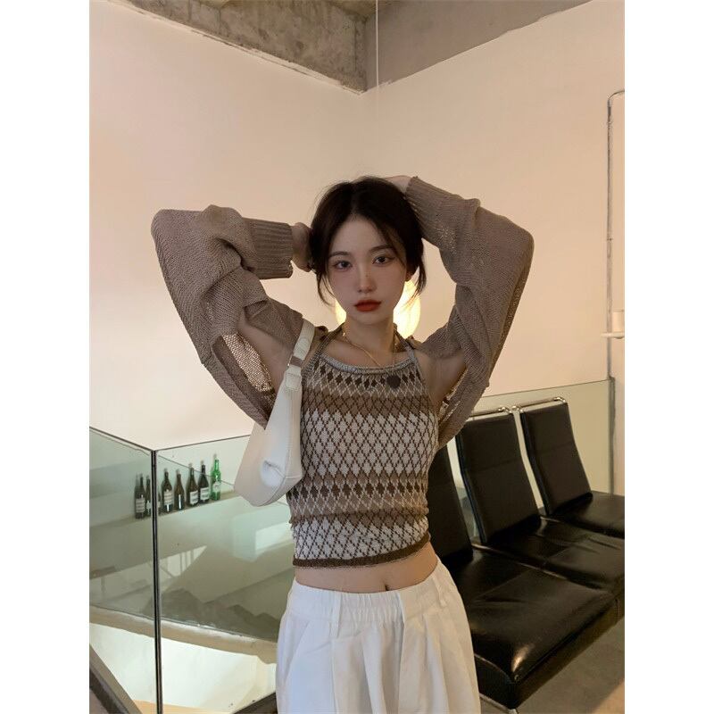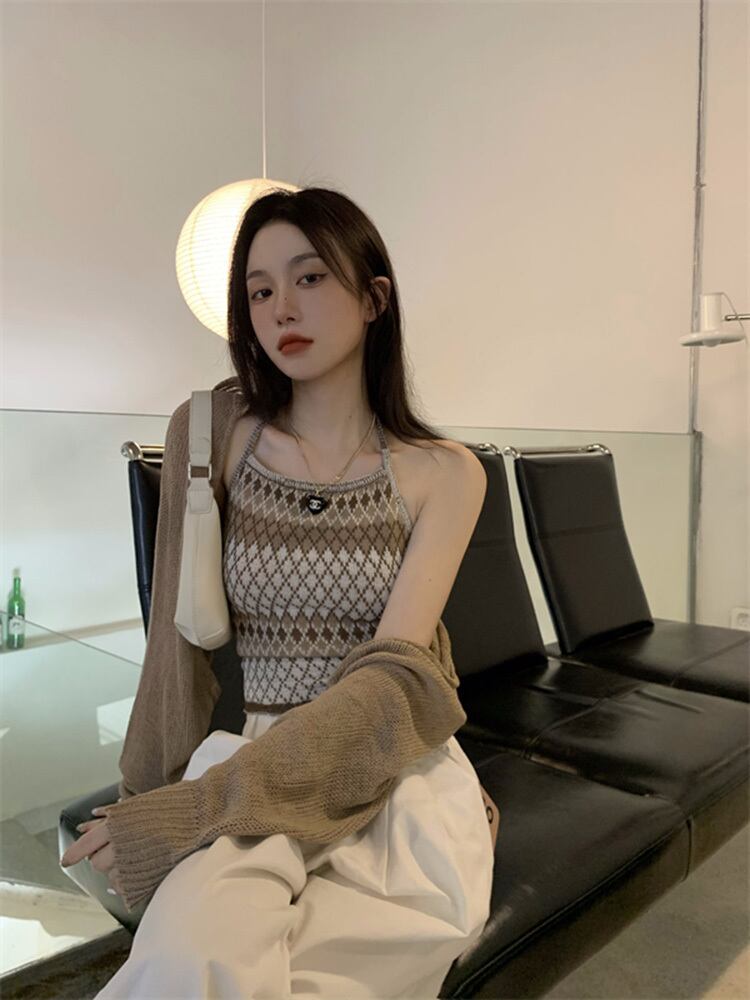 スタンダード格子柄ニットレディースサマーバックショートトップス レトロ 夏物 フラワークラフター93070290521