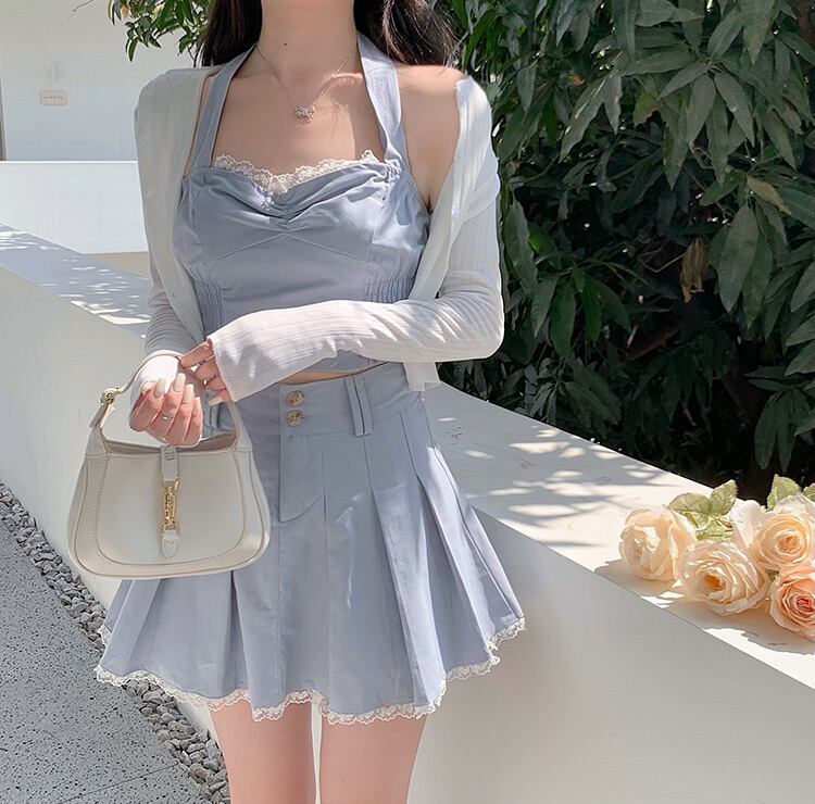 レースプリーツスカート ハイウェストウェストAラインショートサマーブルー 夏物 ステッチ フラワークラフター63644276452
