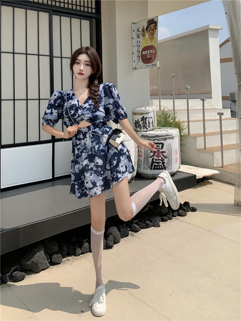 スリーブドレス サマーVネックウェスト薄手Aラインショートスカート 夏物 フラワークラフター29164251900