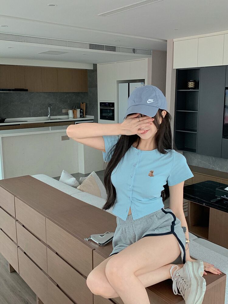色:スモッグブルー半袖,グレーのカジュアルショーツ