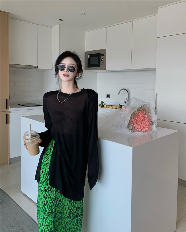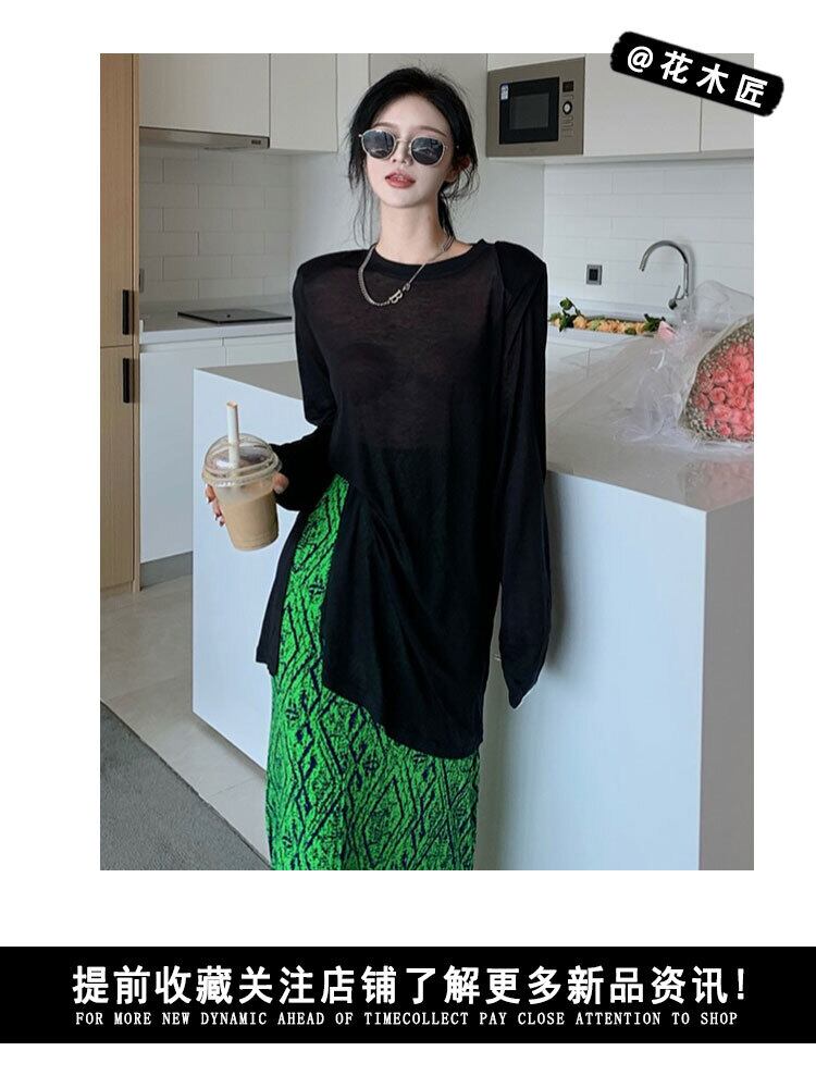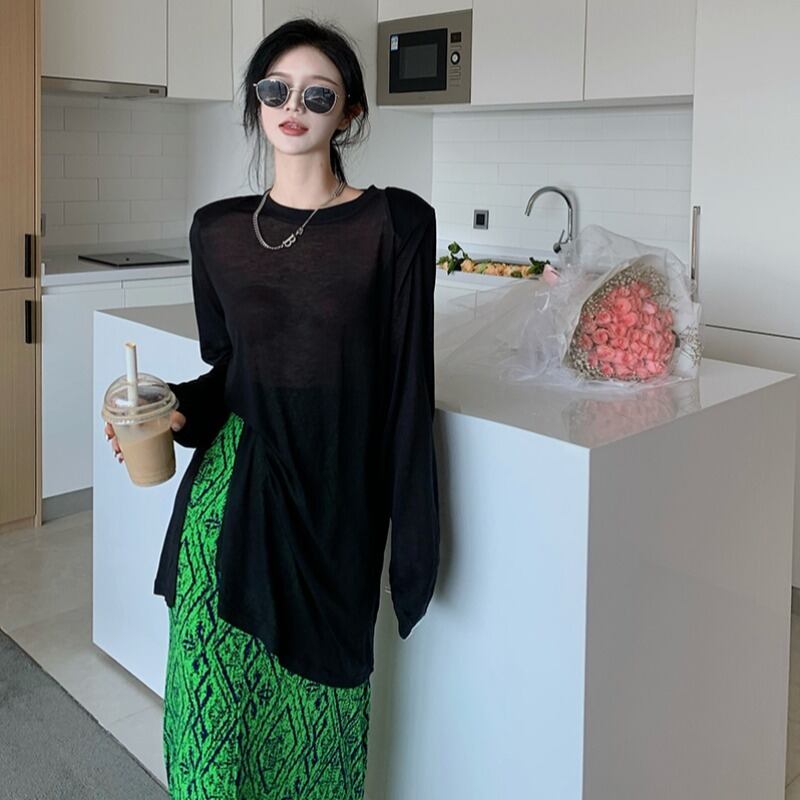 ブラックTシャツ レディースサマー薄手ルーズトップス ロング 夏物 フラワークラフター35499207776