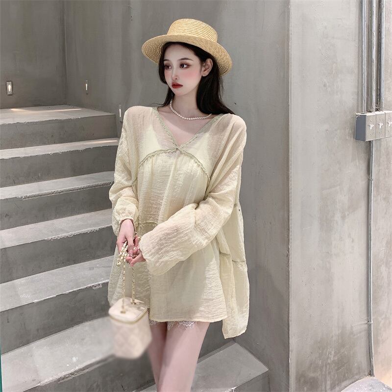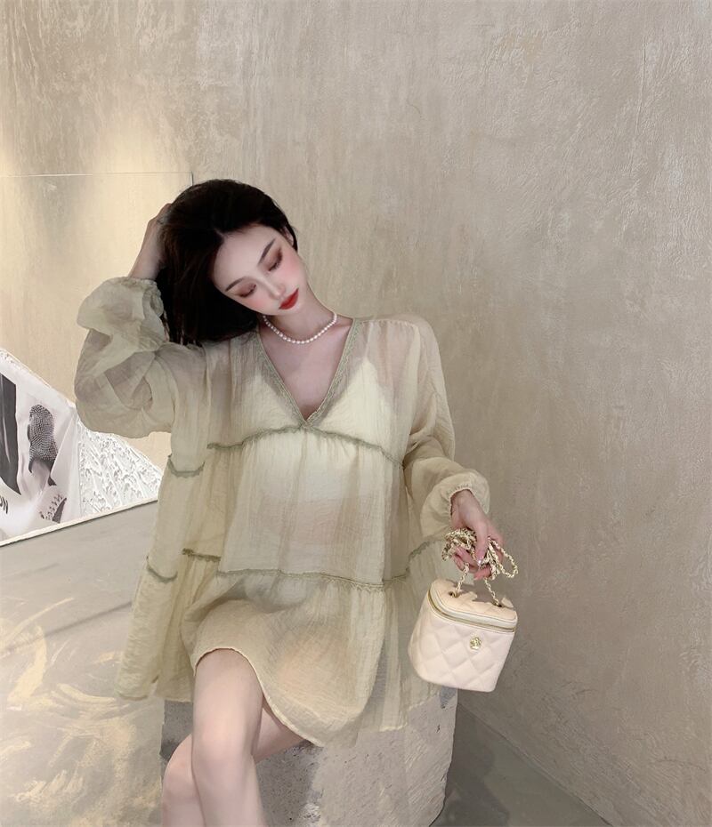 Vネックシャツ サマー薄手ルーズ ロング 夏物 フラワークラフター2364078142