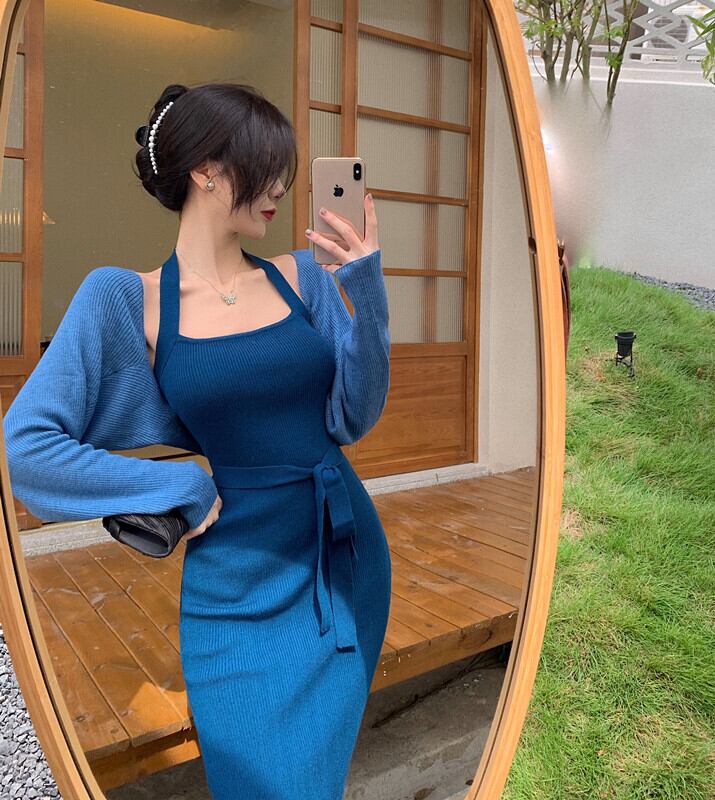ブルーニットドレス サマースタイルウェストスカート 夏物 フラワークラフター40762471656