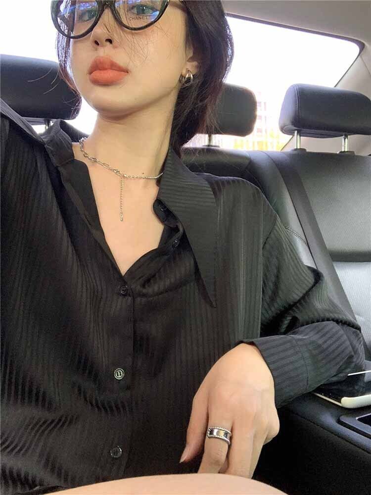 ブラックストライプシャツ オータムルーズトップス ロング 秋物 フラワークラフター10705974035