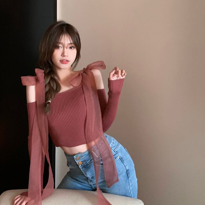 リボンニットセーター レディーススプリングオータムスタイルスリムショートトップス ロング 大人ガーリー スウィート キュート カジュアル 春物 秋物 オフショルダー フラワークラフター76584166421